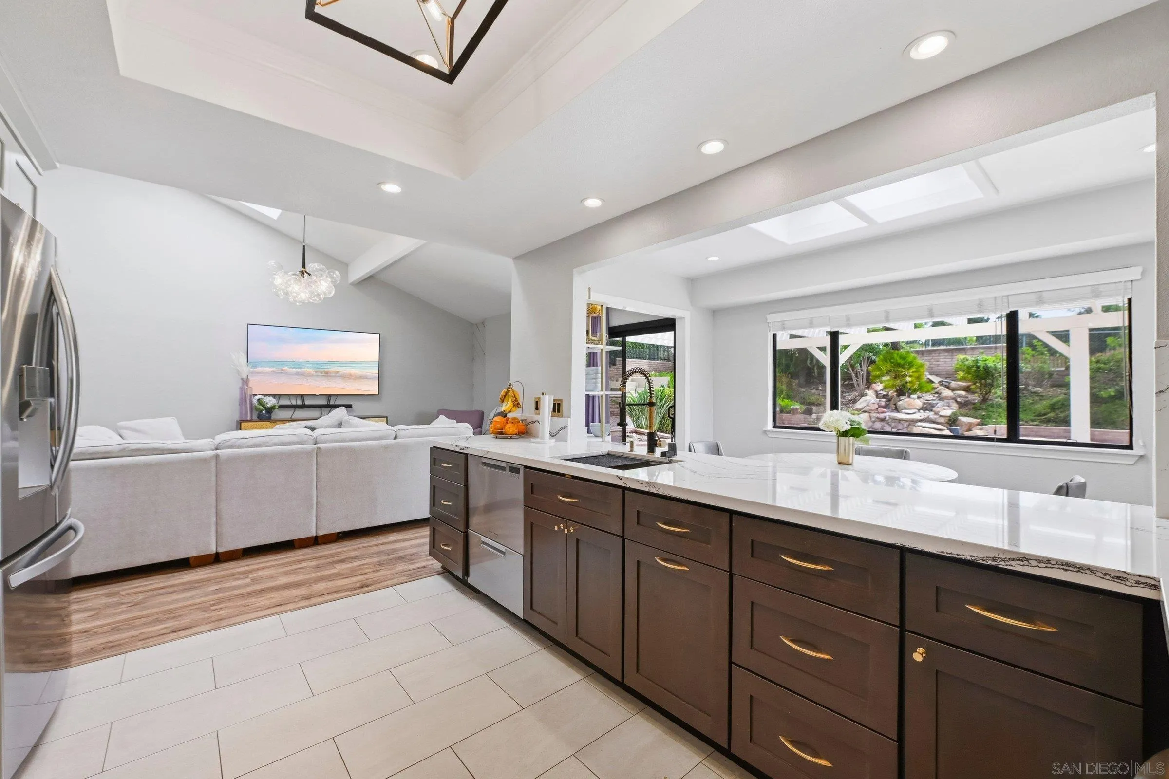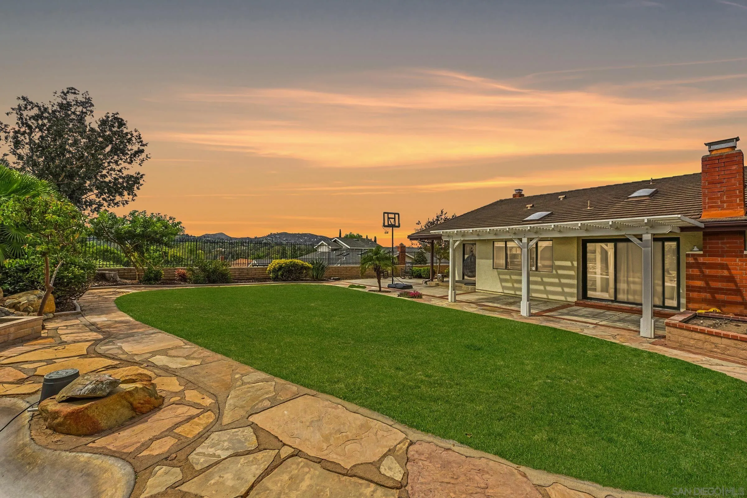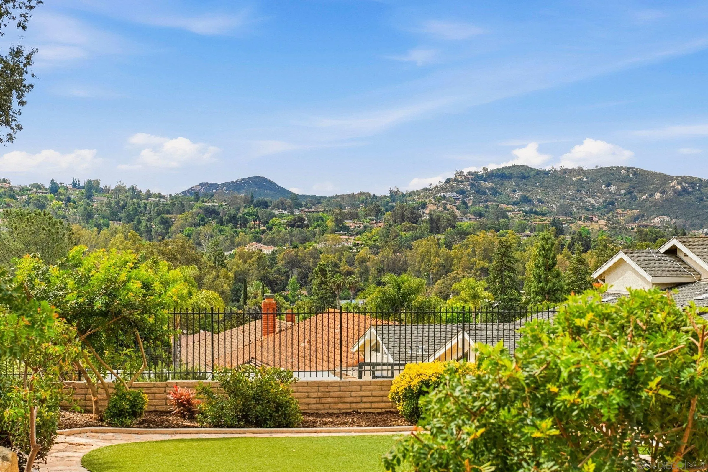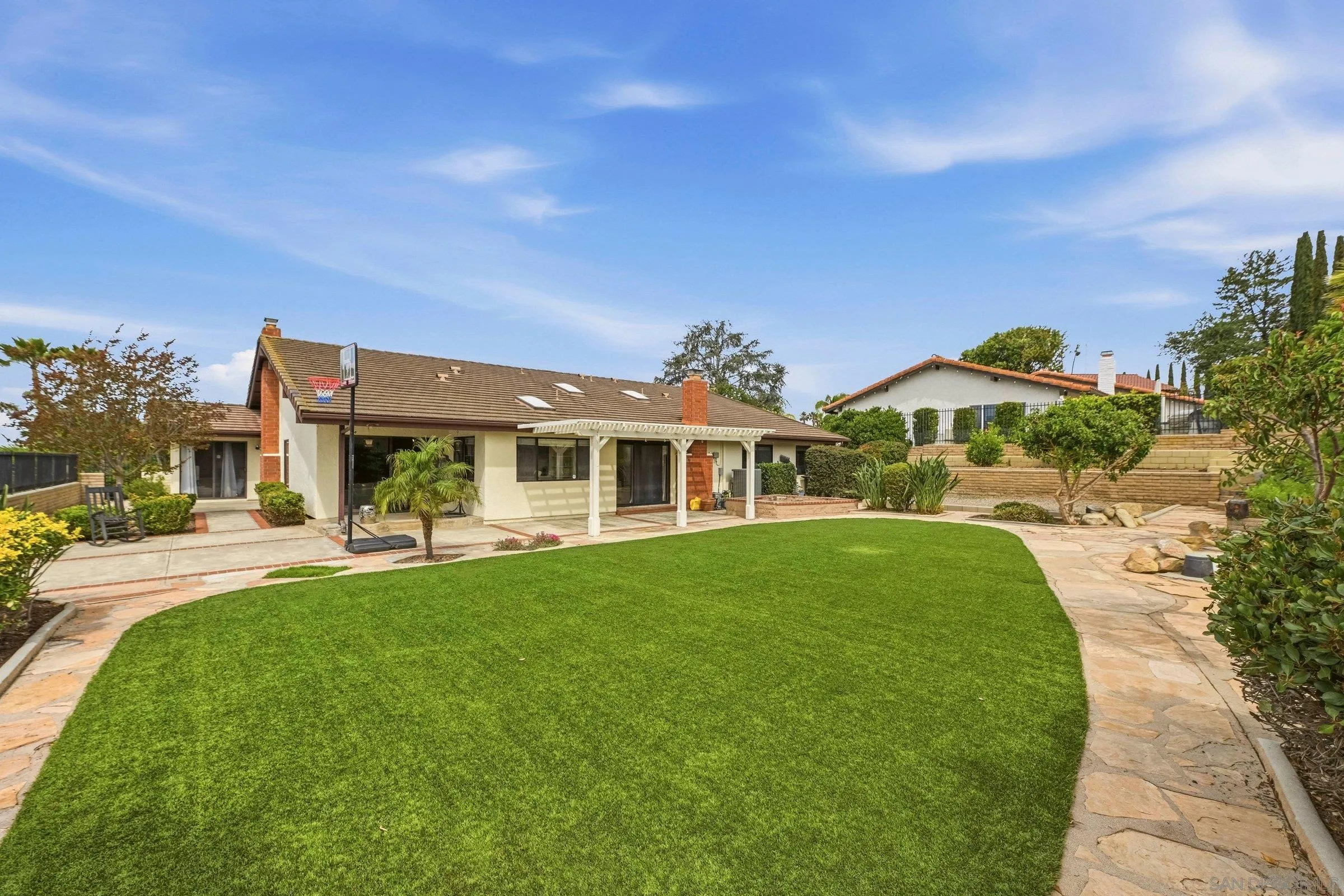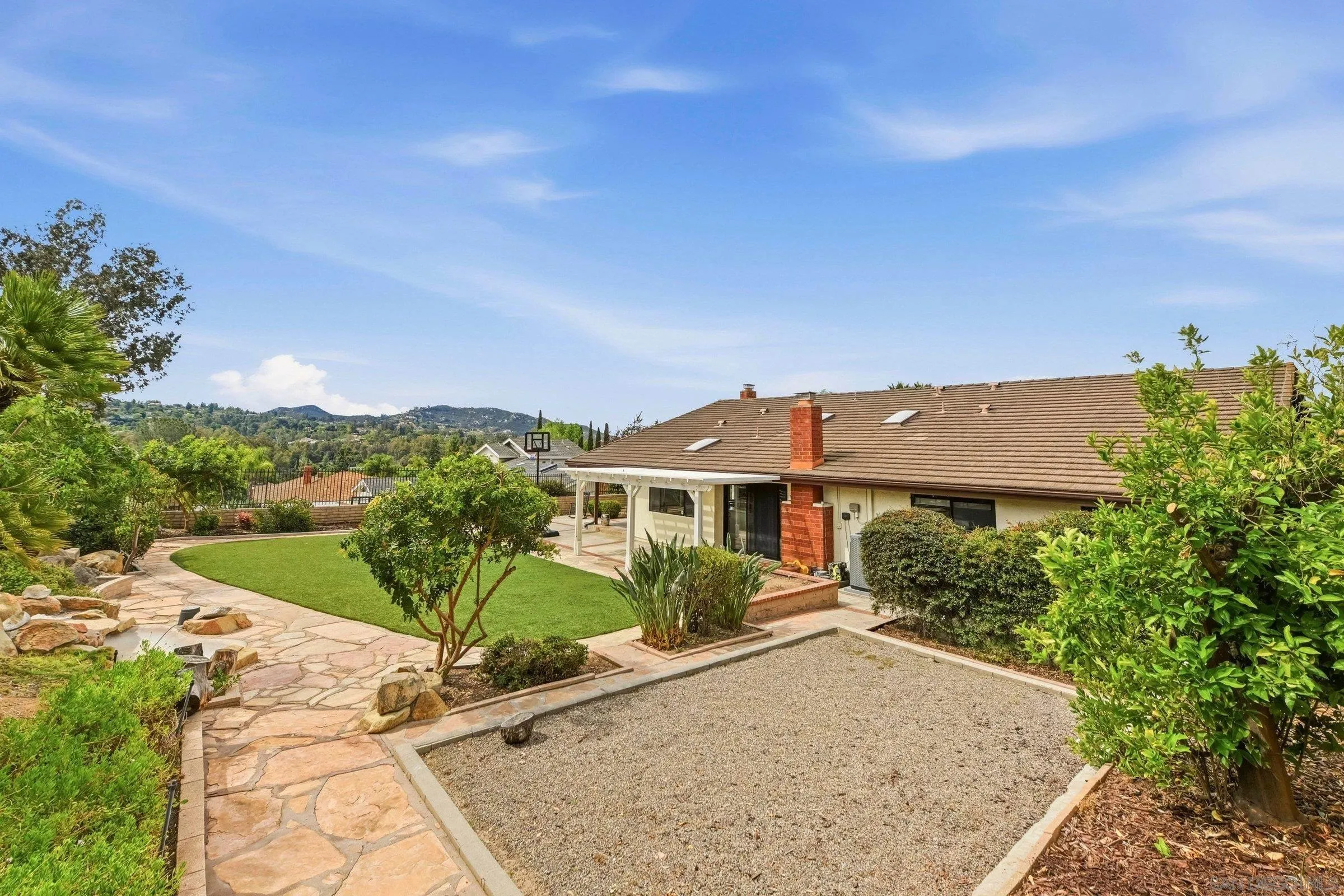 Set within the coveted Stoneridge enclave of Poway, this refined single-story residence offers an elevated blend of comfort, style, and effortless living. Spanning approximately 2,390 square feet, the five-bedroom, three-bathroom home sits on an expansive ~0.3-acre lot, thoughtfully curated to maximize both privacy and scenic surroundings. A seamless flow is complemented by wide-plank laminate flooring, designer lighting, and a beautifully reimagined kitchen that serves as the heart of the home, featuring stainless steel appliances, a dual-drawer dishwasher, and an adjacent bar area ideal for entertaining. Two distinct living spaces, each anchored by its own fireplace, provide inviting settings for both intimate evenings and larger gatherings, while a newly added wet bar with wine refrigeration enhances the home’s entertaining appeal. Everyday functionality meets modern sophistication with an upgraded electrical panel, refreshed closet doors, and a newer washer and dryer.
