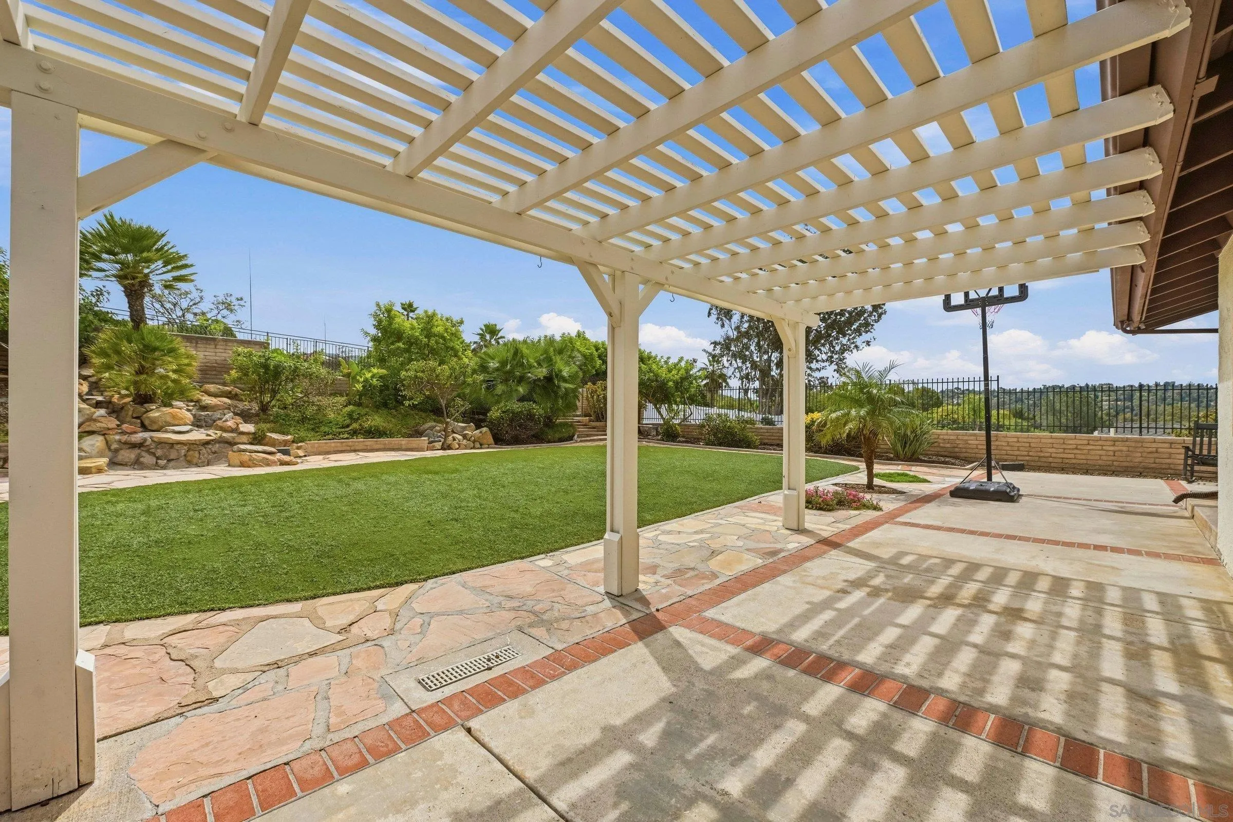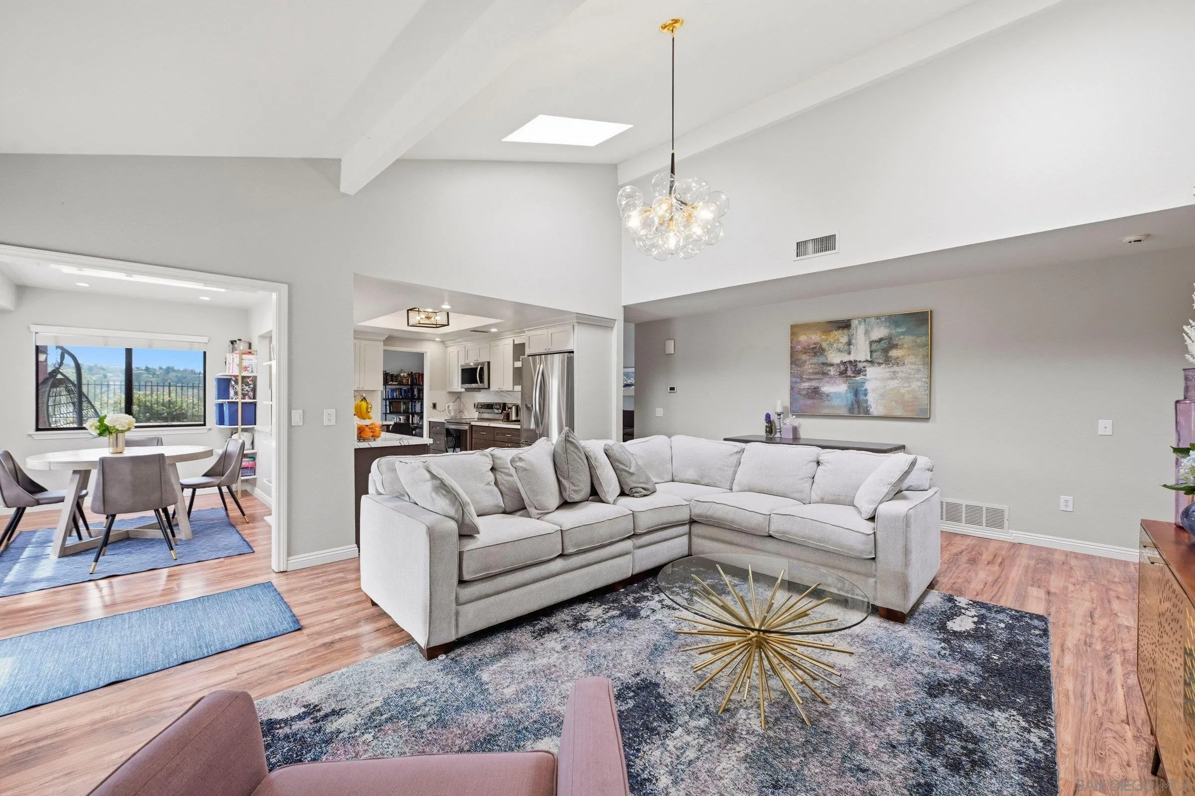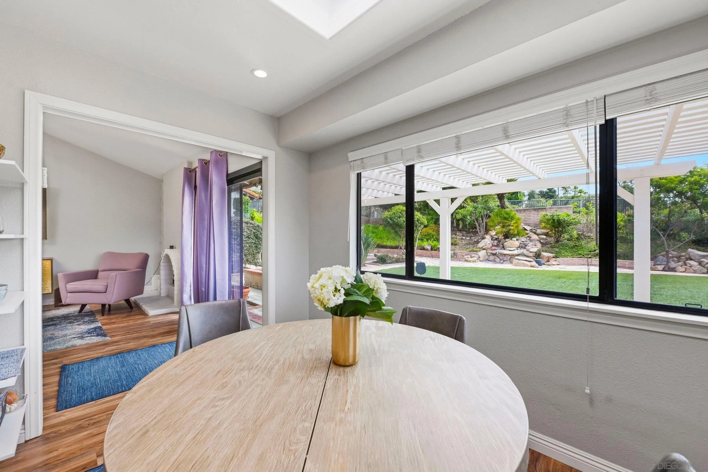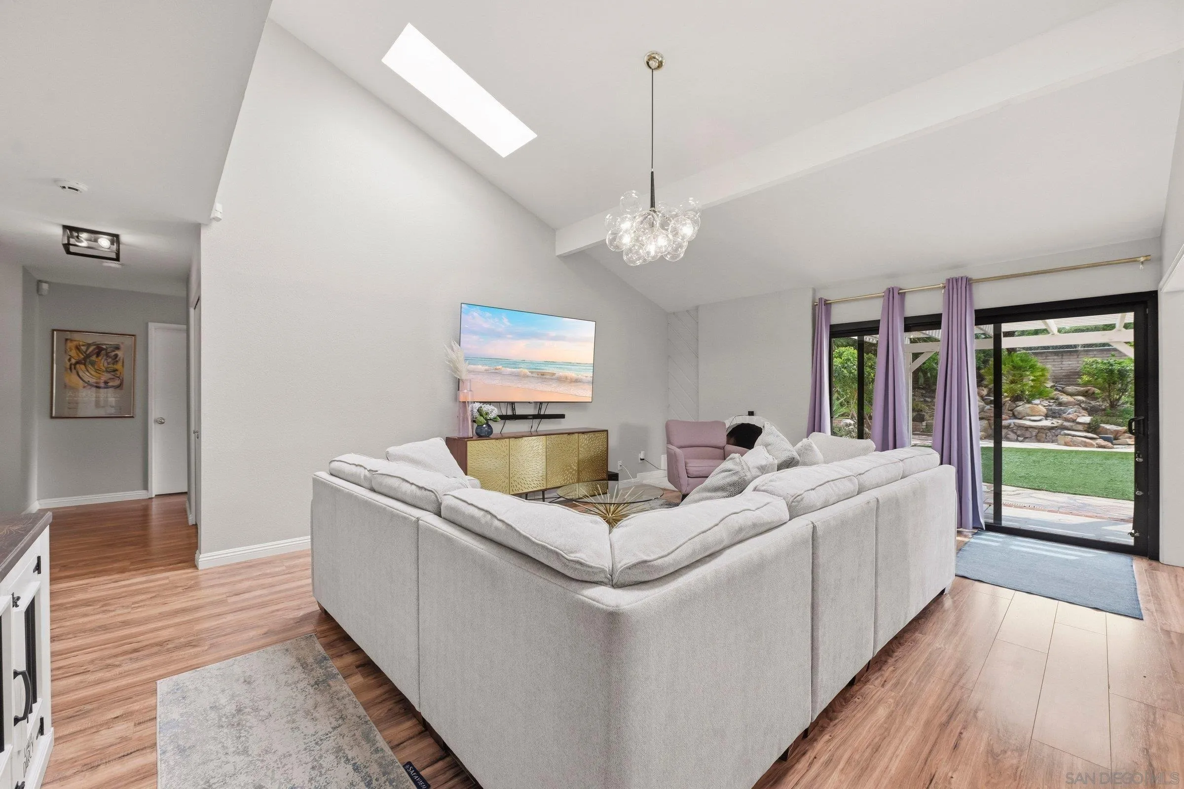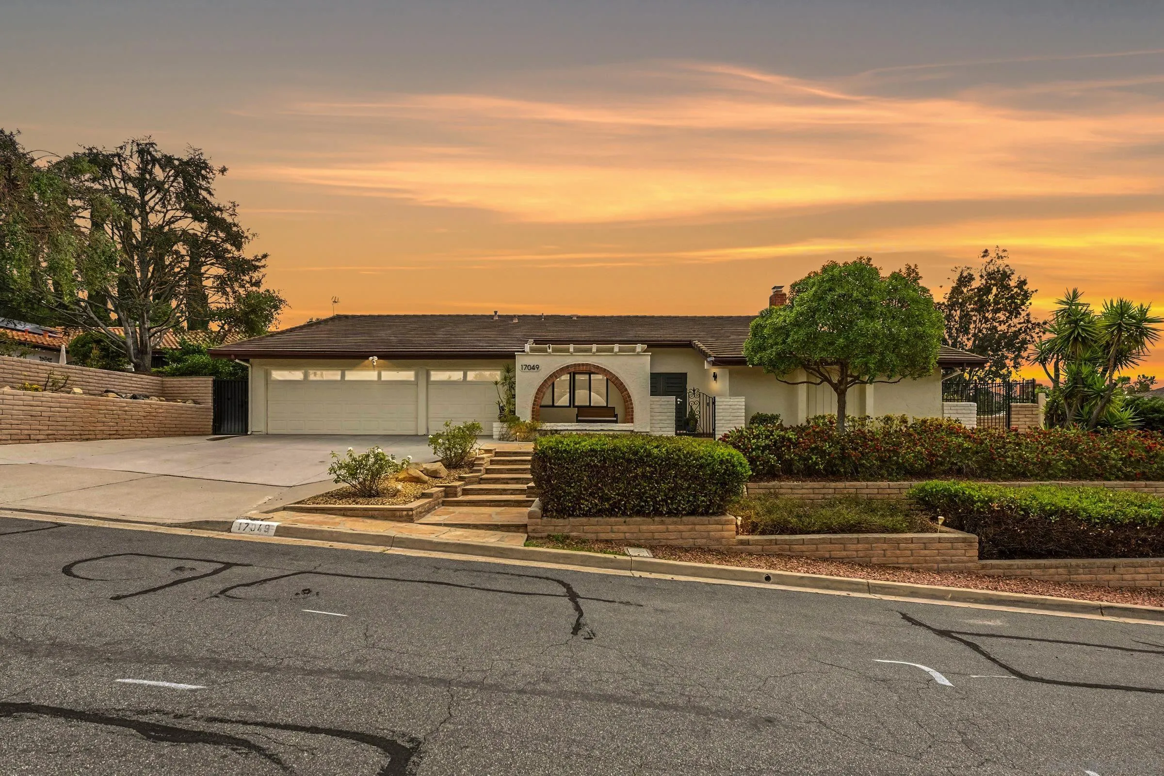Set within the coveted Stoneridge enclave of Poway, this refined single-story residence offers an elevated blend of comfort, style, and effortless living. Spanning approximately 2,390 square feet, the five-bedroom, three-bathroom home sits on an expansive ~0.3-acre lot, thoughtfully curated to maximize both privacy and scenic surroundings. A seamless flow is complemented by wide-plank laminate flooring, designer lighting, and a beautifully reimagined kitchen that serves as the heart of the home, featuring stainless steel appliances, a dual-drawer dishwasher, and an adjacent bar area ideal for entertaining. Two distinct living spaces, each anchored by its own fireplace, provide inviting settings for both intimate evenings and larger gatherings, while a newly added wet bar with wine refrigeration enhances the home’s entertaining appeal. Everyday functionality meets modern sophistication with an upgraded electrical panel, refreshed closet doors, and a newer washer and dryer.