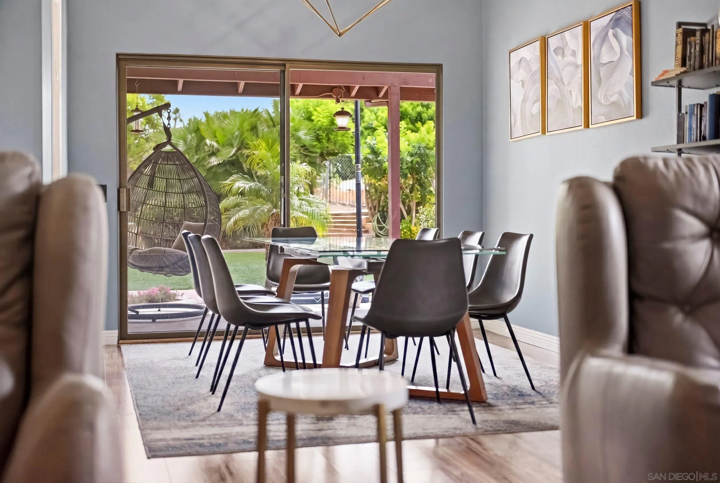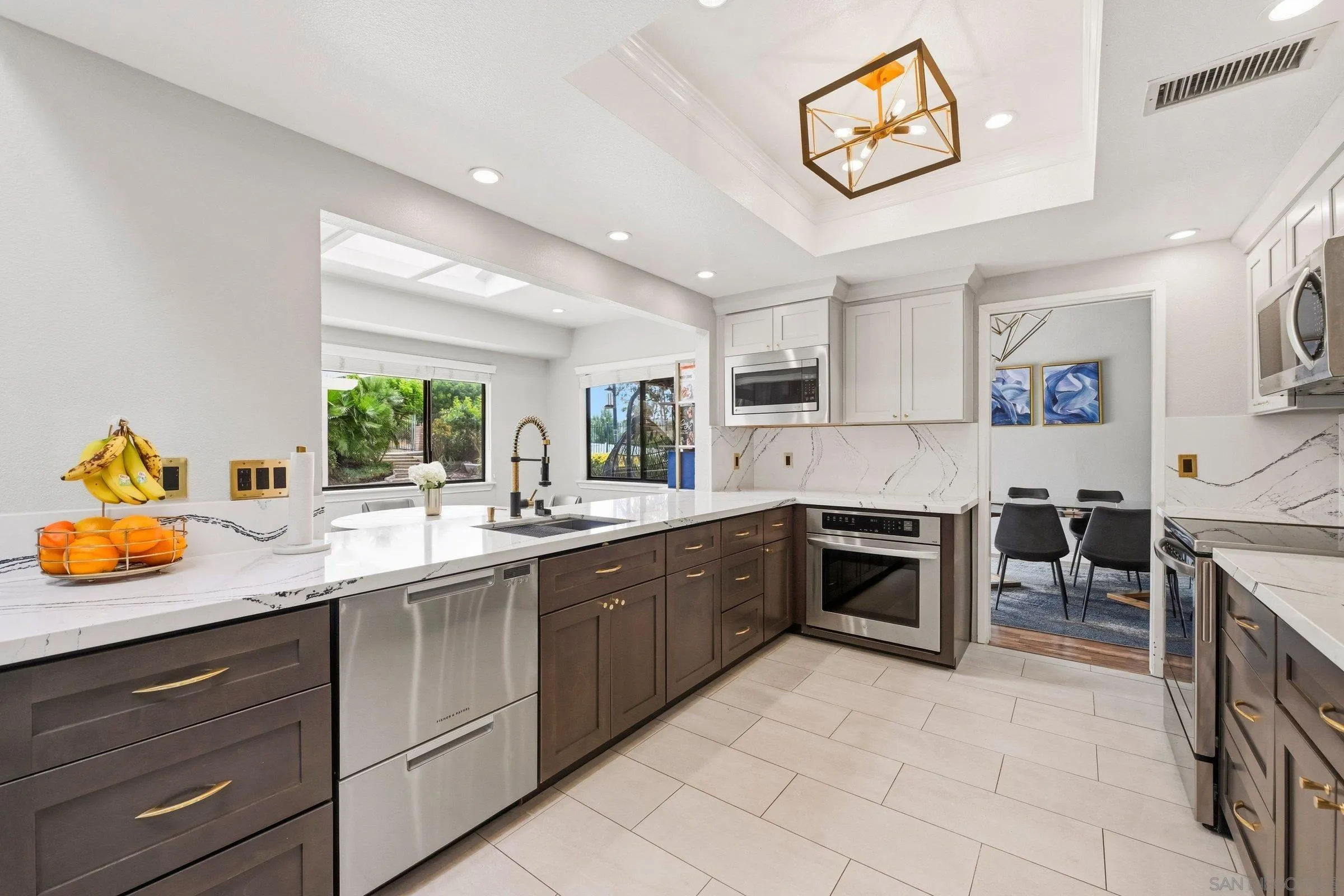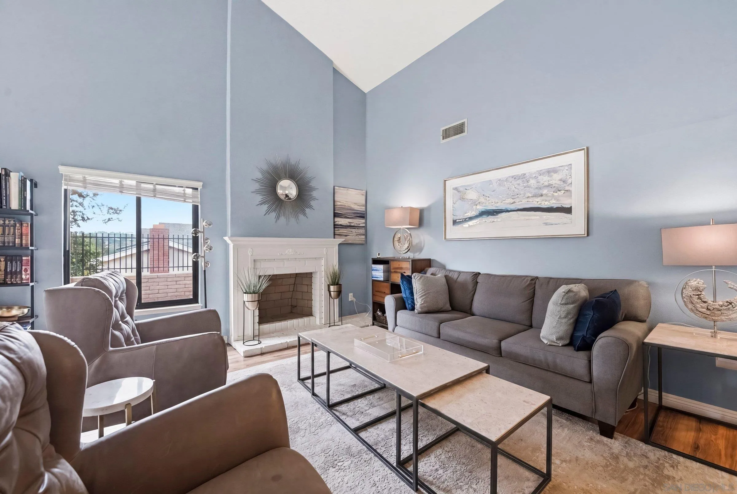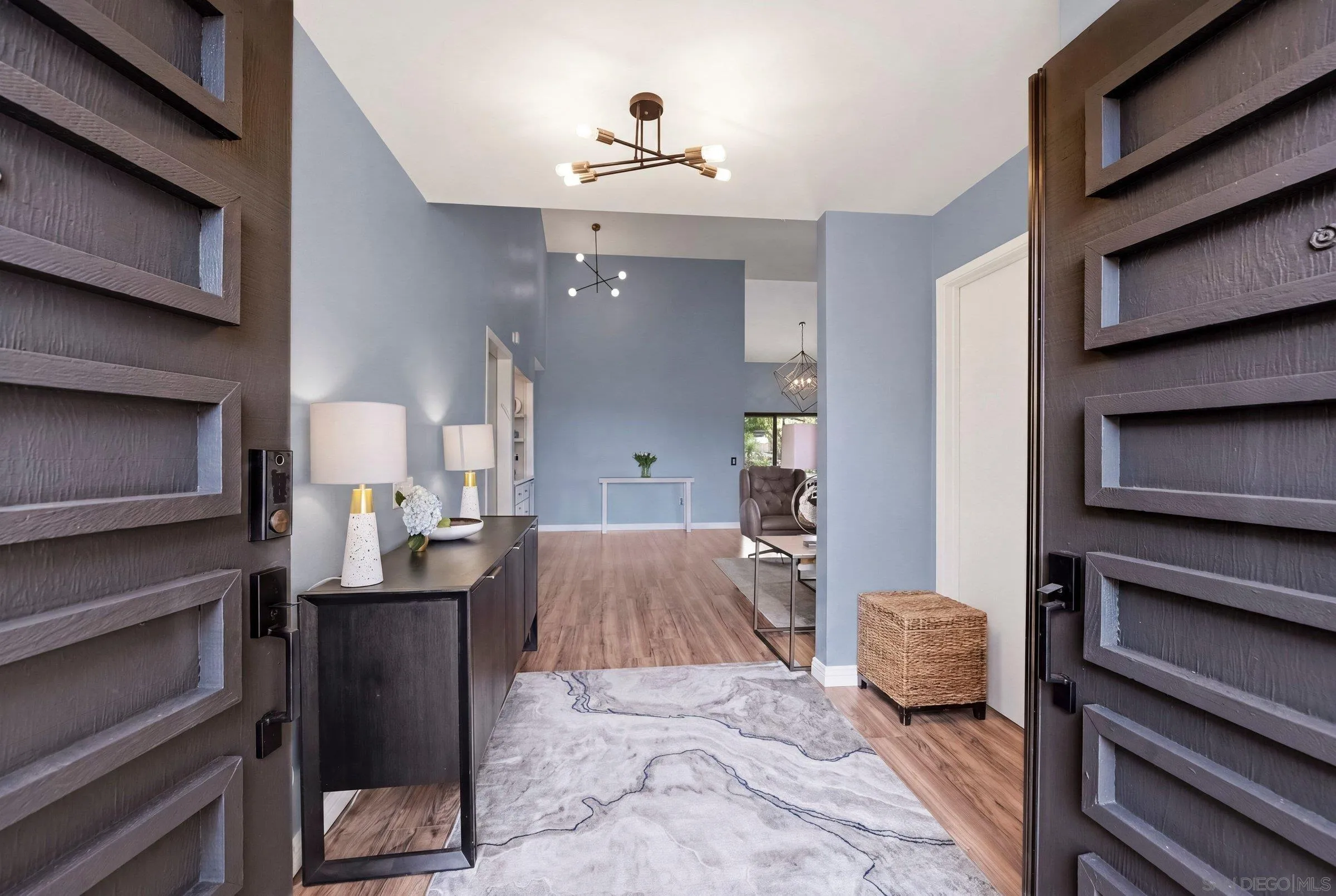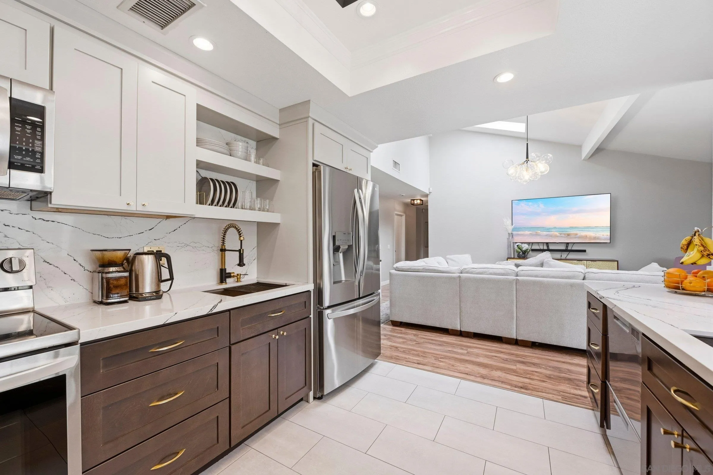 Set within the coveted Stoneridge enclave of Poway, this refined single-story residence offers an elevated blend of comfort, style, and effortless living. Spanning approximately 2,390 square feet, the five-bedroom, three-bathroom home sits on an expansive ~0.3-acre lot, thoughtfully curated to maximize both privacy and scenic surroundings. A seamless flow is complemented by wide-plank laminate flooring, designer lighting, and a beautifully reimagined kitchen that serves as the heart of the home, featuring stainless steel appliances, a dual-drawer dishwasher, and an adjacent bar area ideal for entertaining. Two distinct living spaces, each anchored by its own fireplace, provide inviting settings for both intimate evenings and larger gatherings, while a newly added wet bar with wine refrigeration enhances the home’s entertaining appeal. Everyday functionality meets modern sophistication with an upgraded electrical panel, refreshed closet doors, and a newer washer and dryer.