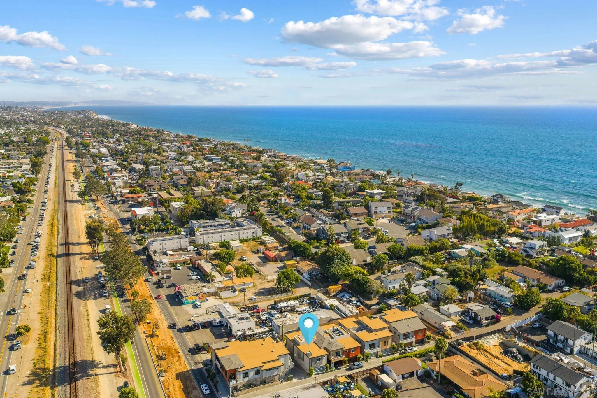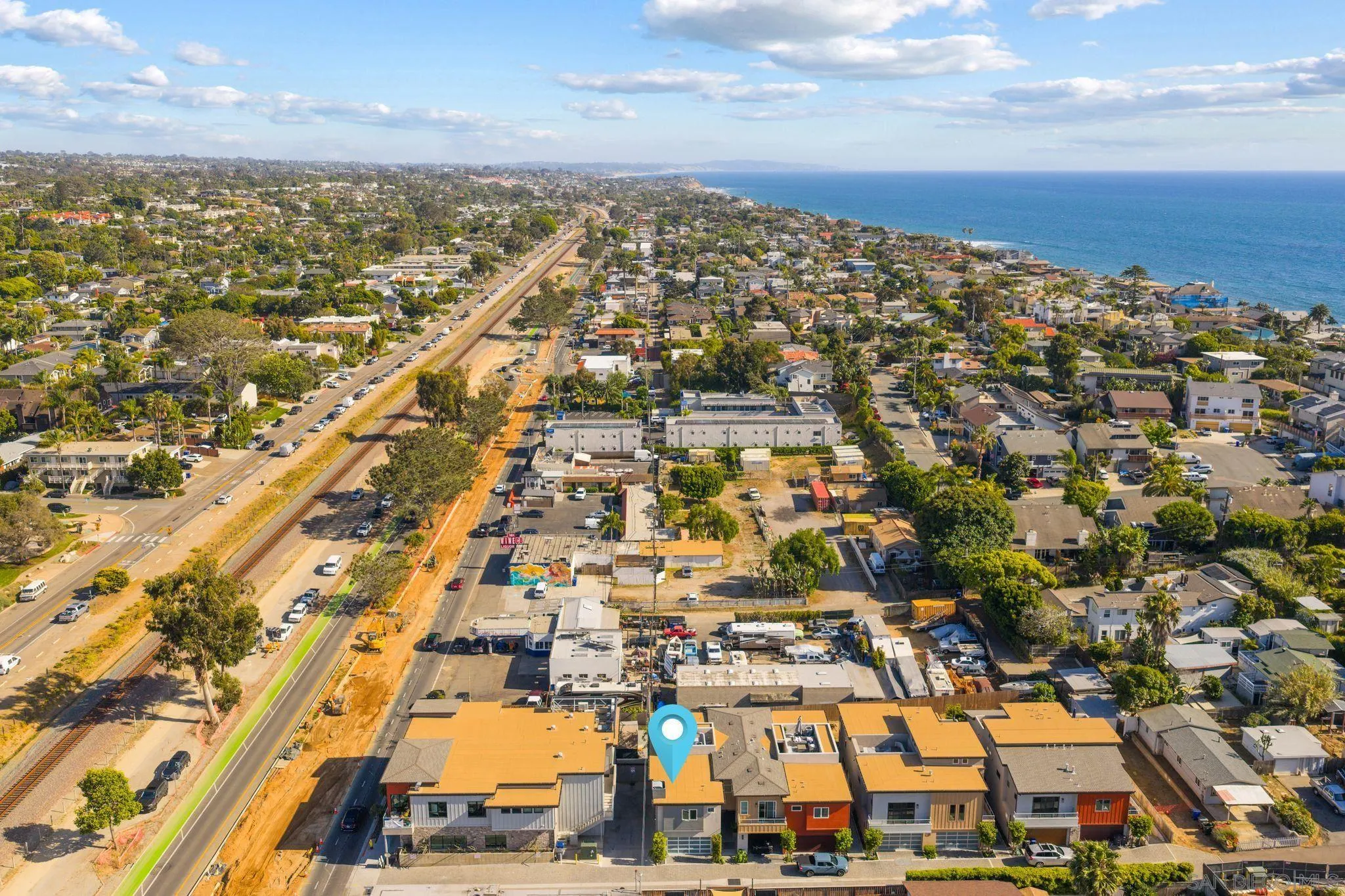 Nestled on the coveted west side of Coast Highway in the heart of Leucadia, Surfside Luxury Lofts delivers the ultimate coastal lifestyle one block from the sand and steps from the neighborhood's beloved restaurants, boutique shops, and world-class surf breaks. This masterfully designed 3-bedroom, 2.5-bath multi-level residence is newer construction at its finest, where sophisticated modern design meets the effortless, sun-drenched spirit of North County San Diego. From the moment you step inside, wide-plank white oak flooring, flat-slab cabinetry, and elegantly veined quartz countertops set a tone that is both timeless and distinctly elevated. Every finish was intentionally curated creating spaces that feel refined without sacrificing warmth or livability. The main level is built for real life. A thoughtfully appointed chef's kitchen opens seamlessly to the great room, anchored by a striking fireplace that brings both style and soul to the living space. Sliding doors connect to a private patio ideal for morning coffee, alfresco dining, or evening entertaining indoor and outdoor living in perfect harmony. Upstairs, three serene bedrooms offer a true retreat. The primary suite is a private sanctuary designed for rest and rejuvenation, while the additional bedrooms provide flexibility for family, guests, or a dedicated home office. A private upper-level balcony captures the coastal breeze and offers a peaceful perch above the neighborhood energy below. A sprawling private rooftop deck purpose-built for Leucadia sunsets. An exceptional opportunity to own newer construction.