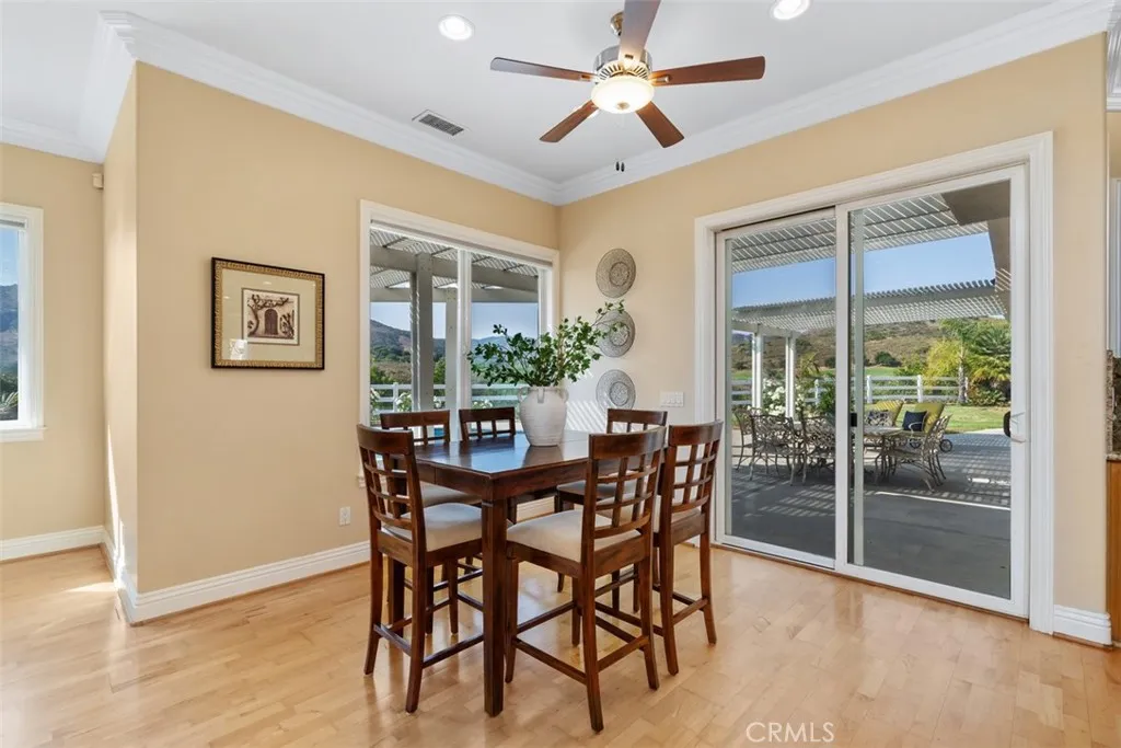 PRICE REDUCTION. This property is located on almost 10 acres in the desirable De Luz community with a 3963 sq.ft. main house plus a 1400 sq.ft. detached guest house. Both homes have amazing views and breathtaking sunsets including views of the local Cross Creek golf course. Other features include a swimming pool and spa, an organic avocado and citrus grove, family orchard, a huge RV garage and a great location with an easy drive to town. The custom built main home has 12ft. high ceilings in the entry with 10ft. ceilings throughout. Features throughout the main house includes wood flooring, custom quality crown molding,built in cabinets and was specifically designed to enjoy the views from almost every room providing lots of natural light throughout. The well designed kitchen includes a large island, granite countertops, newer appliances including double ovens and a sub zero refrigerator plus lots of cabinetry and storage and a walk in pantry. The comfortable family room features a custom built fireplace encased by built in cabinets on either side. The huge private master suite overlooks and opens to the landscaped fenced backyard and pool and spa area. There is a lovely separate formal living room and dining room plus an office with built in cabinets and book shelves. The 4th bedroom with an en suite bathroom is upstairs. Other features include a new water filtration system, newer AC units plus central vac system. The guest house was built in 2006. It features a living room, totally self contained kitchen, two bedrooms plus a full bathroom. It also has an outdoor enclosed l