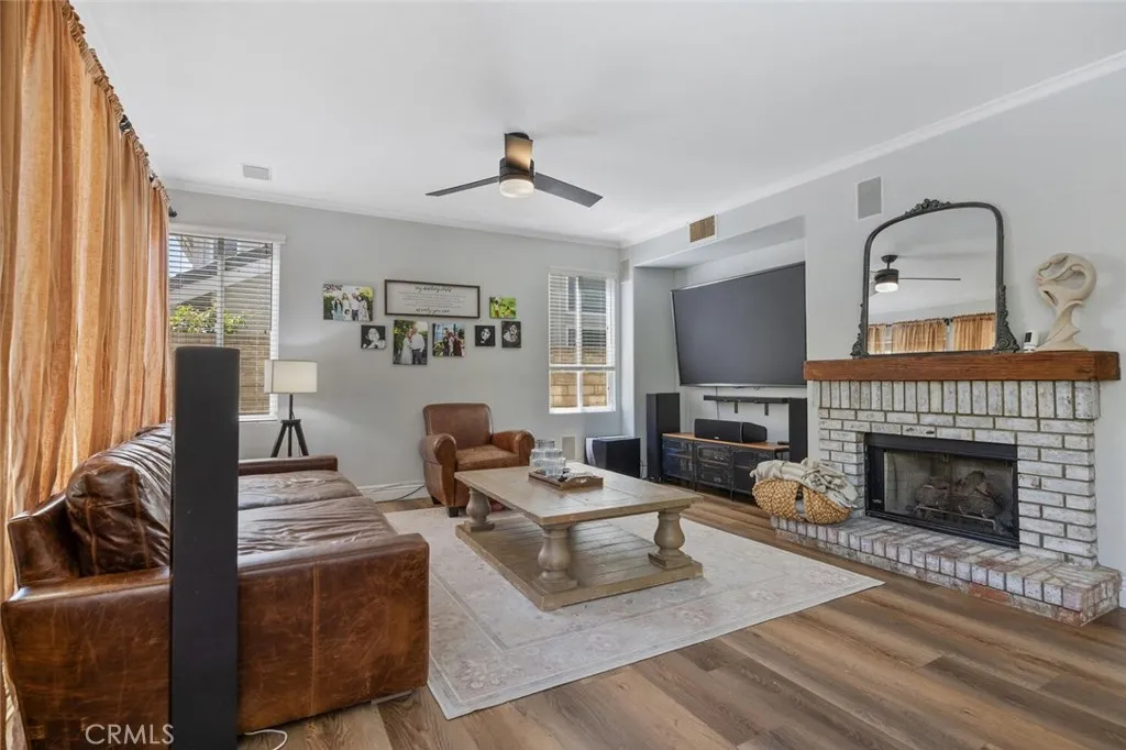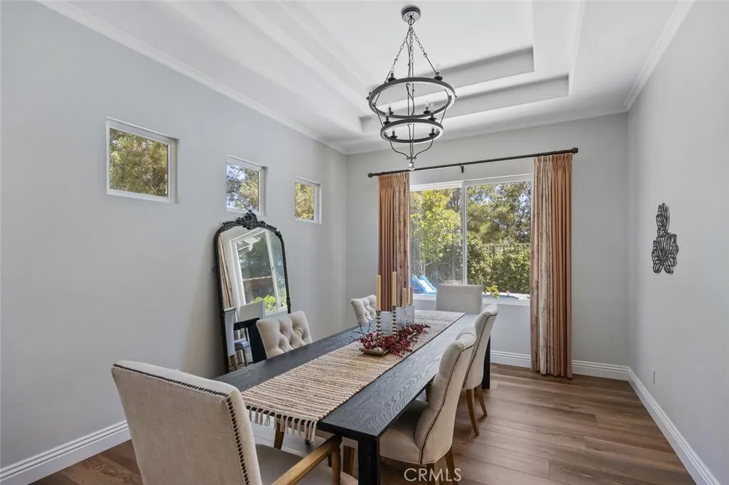 Exquisite Northbridge POOL, SPA and VIEW home on sweeping Flag Lot at the top of a tree lined cul de sac street with OWNED SOLAR! This beautifully upgraded 2 story home features 4 bedrooms and 3 full bathrooms (one on the MAIN FLOOR) plus a 3-car garage with tons of storage and epoxy coated flooring! The soaring cathedral ceilings, regal winding staircase and plethora of picture windows offers abundant natural light leaving a lasting impression upon entering this beautiful home! With neutral, wide luxury vinyl plank flooring, recessed lighting and designer finishes this Valencia home is truly move-in ready! The light and bright living room flows seamlessly into the formal dining area, highlighted by large windows and an elegant chandelier! The heart of the home is the beautifully upgraded kitchen featuring a gorgeous, quartz topped center island with bar seating, stainless steel appliances and glass cabinetry accents! The kitchen conveniently opens to the spacious and inviting family room complete with brick fireplace, wood mantle, crown molding, and ceiling fan! This main living space overlooks the sparkling swimming pool, covered patio and built-in BBQ! The main floor also boasts a huge DOWNSTAIRS BEDROOM AND BATH! Tastefully upgraded with pebble like flooring, glass accents and designer lighting! Adjacent you will find the convenient laundry room complete with utility sink and extra storage leading to the 3 car garage! The entertainers backyard is a true retreat with a sparkling pool and spa, cascading waterfall, covered patio, and a stone bar top complete with built-in
