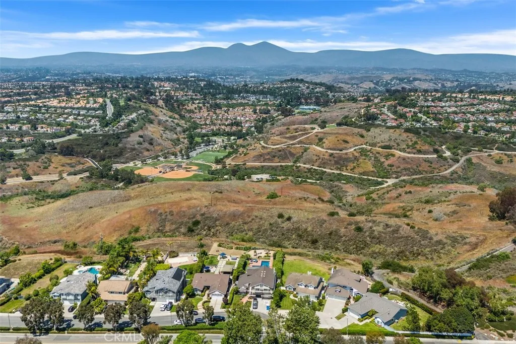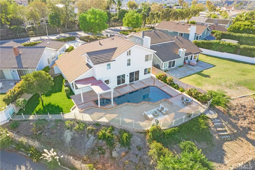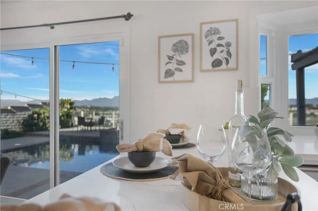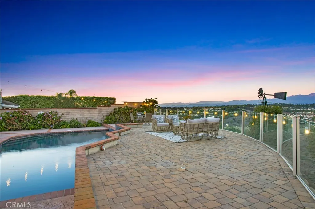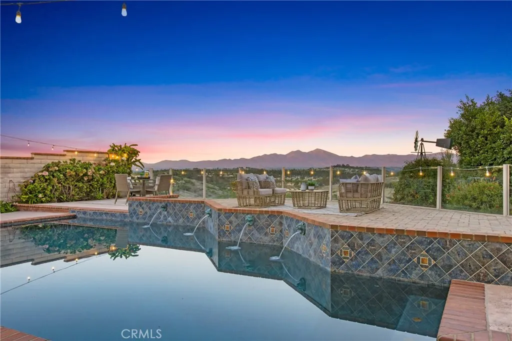 PANORAMIC SADDLEBACK MOUNTAIN VIEWS YEAR ROUND & snow-capped mountain views this gorgeous, just remodeled, picturesque property! This beautifully maintained home on a single loaded street offers 4 bedrooms and 3 bathrooms, including a desirable main floor bedroom, and is situated on an expansive 14,000 sq ft lot that extends onto the serene slope behind providing both space and privacy. The private backyard features a pool with premium Hydrazzo plaster and updated tile, glass fencing along the perimeter to showcase the views, and lush landscaping, a mature lemon tree, and with brand new grass in both the front and back yards.The upgraded interior includes three new chandeliers in the dining room, kitchen nook and entry way, brand new quartz counter tops and backsplash in the kitchen, rich laminate flooring downstairs, new bathroom vanity with quartz countertop with dual sinks in the primary bathroom with new mirrors and recessed lighting, and a brand new bathroom in the jack and jill bathroom upstairs which includes new flooring, a new dual sink vanity with quartz countertops, a new Pottery Barn light fixture, a new window in the shower and a new glass enclosure all with gold accents. The home is equipped with Milgard dual-pane windows throughout, Ecobee smart thermostat, Genie Wi-Fi smart garage door opener, smart front door lock, & Ring doorbell/outside cameras/alarm system and a freshly painted white interior (June 2025) and exterior (September 2023). Additional upgrades include a 240V charger for Tesla and other EVs, large driveway leads to a three-bay garage with loft