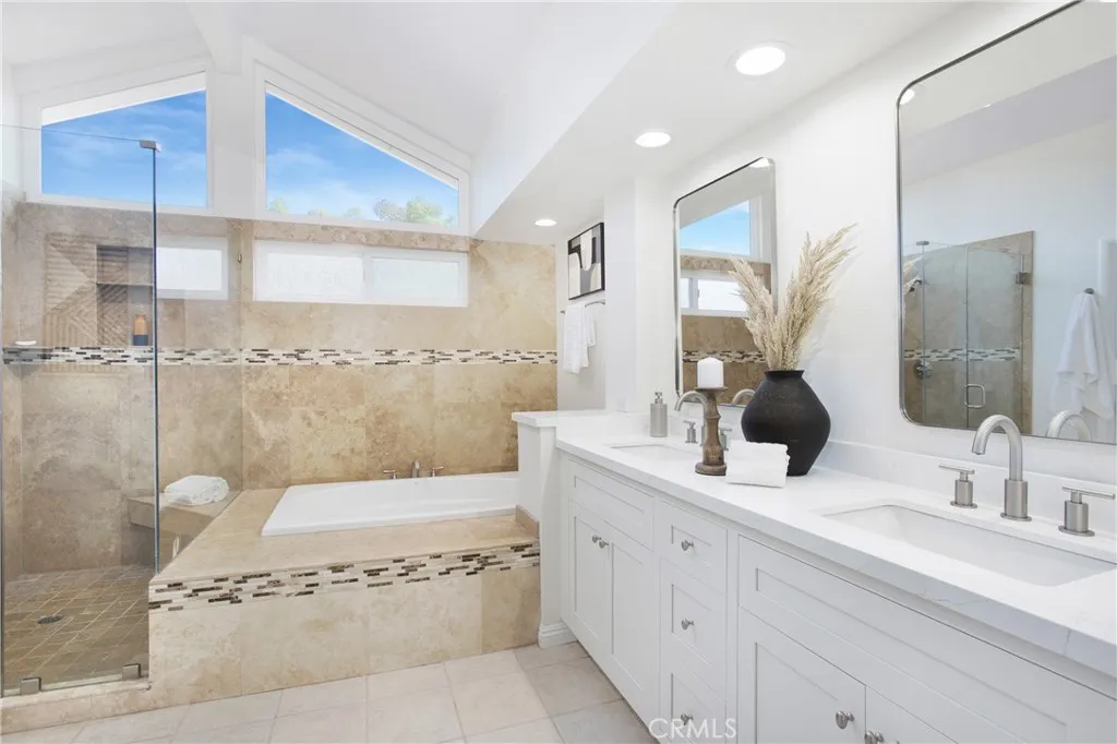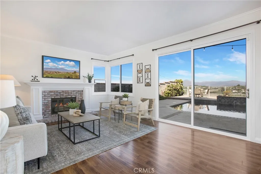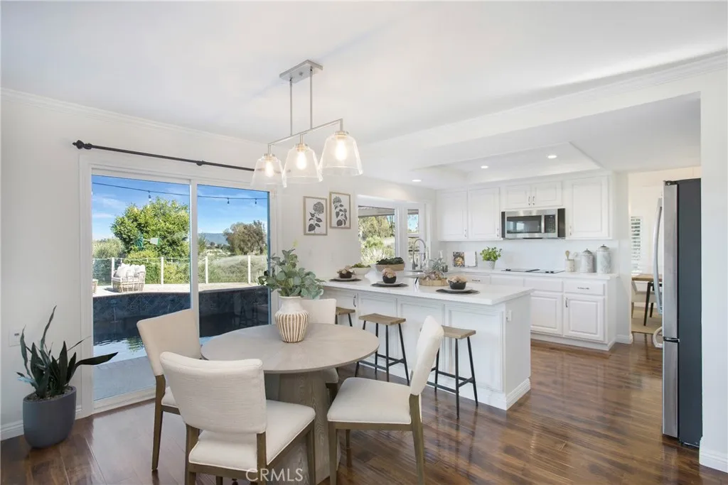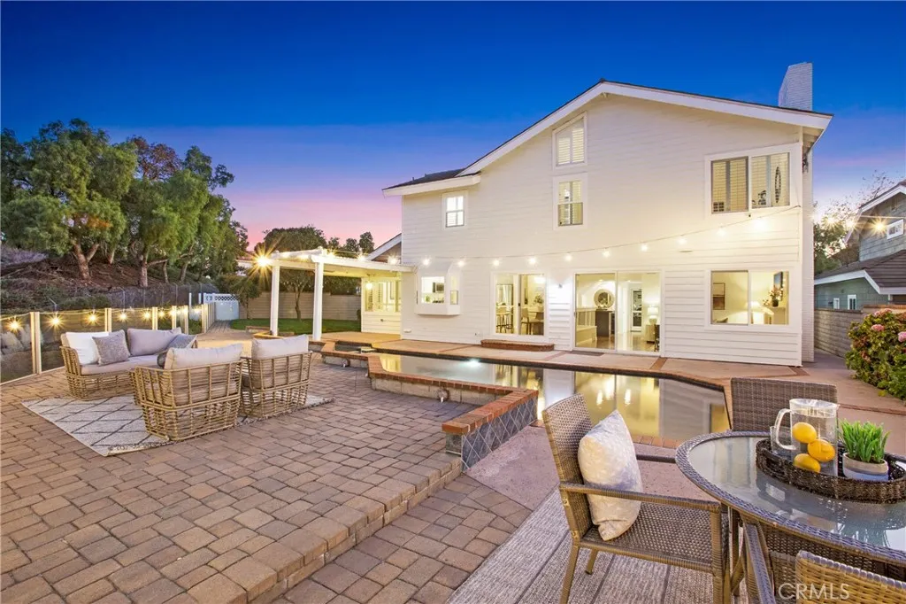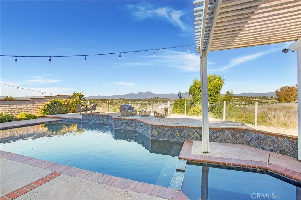 PANORAMIC SADDLEBACK MOUNTAIN VIEWS YEAR ROUND & snow-capped mountain views this gorgeous, just remodeled, picturesque property! This beautifully maintained home on a single loaded street offers 4 bedrooms and 3 bathrooms, including a desirable main floor bedroom, and is situated on an expansive 14,000 sq ft lot that extends onto the serene slope behind providing both space and privacy. The private backyard features a pool with premium Hydrazzo plaster and updated tile, glass fencing along the perimeter to showcase the views, and lush landscaping, a mature lemon tree, and with brand new grass in both the front and back yards.The upgraded interior includes three new chandeliers in the dining room, kitchen nook and entry way, brand new quartz counter tops and backsplash in the kitchen, rich laminate flooring downstairs, new bathroom vanity with quartz countertop with dual sinks in the primary bathroom with new mirrors and recessed lighting, and a brand new bathroom in the jack and jill bathroom upstairs which includes new flooring, a new dual sink vanity with quartz countertops, a new Pottery Barn light fixture, a new window in the shower and a new glass enclosure all with gold accents. The home is equipped with Milgard dual-pane windows throughout, Ecobee smart thermostat, Genie Wi-Fi smart garage door opener, smart front door lock, & Ring doorbell/outside cameras/alarm system and a freshly painted white interior (June 2025) and exterior (September 2023). Additional upgrades include a 240V charger for Tesla and other EVs, large driveway leads to a three-bay garage with loft