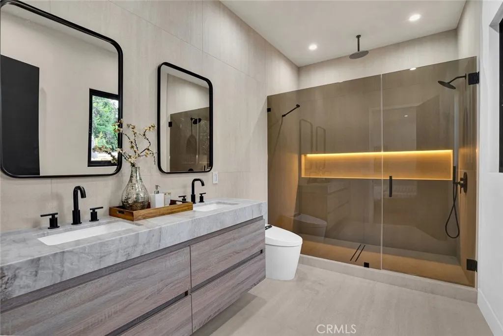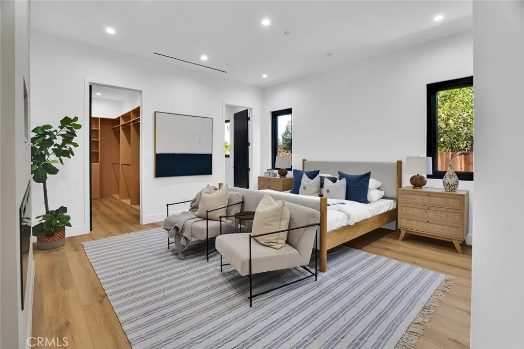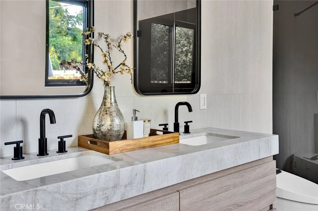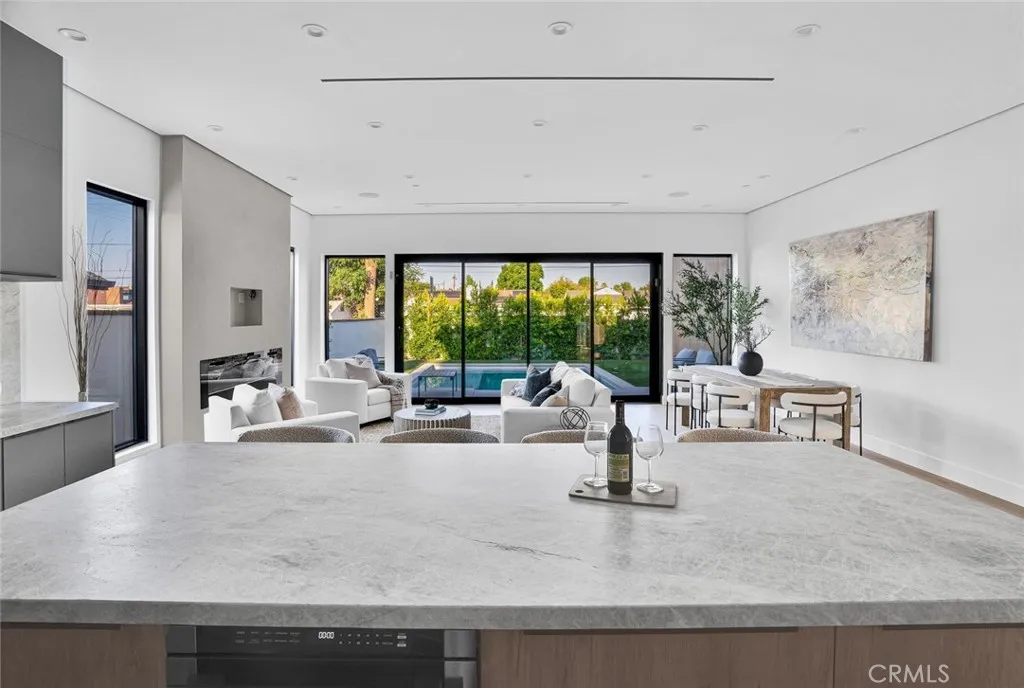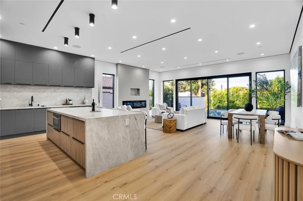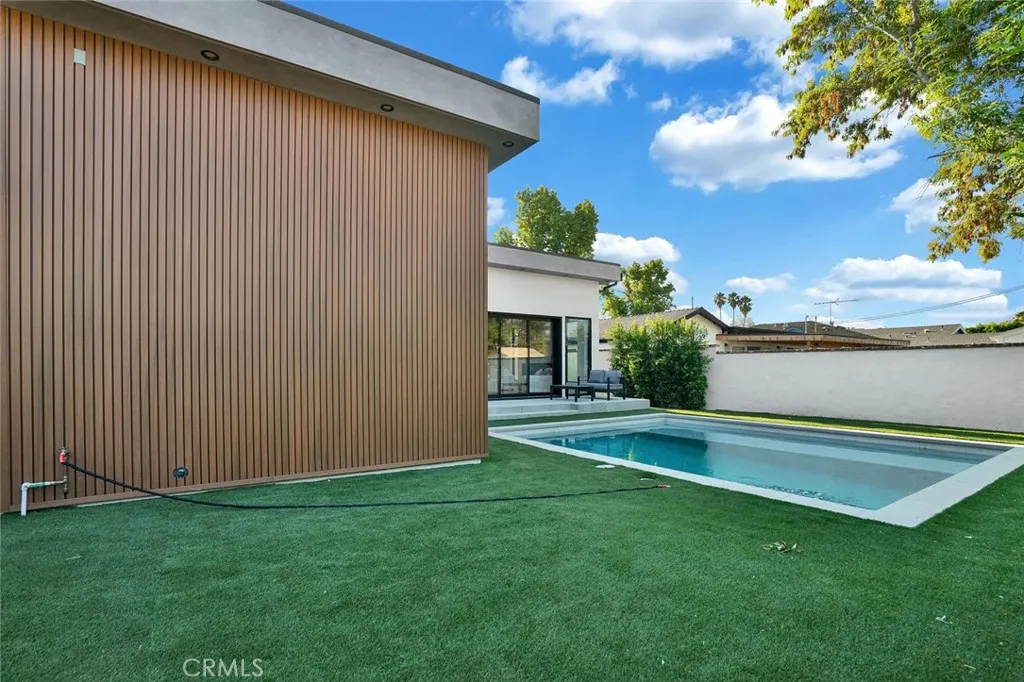 Come see this beautifully almost brand new- 3-bedroom, 3.5-bathroom pool home in Encino, offering 2,107 sq. ft. of stylish living space. The impressive 12-foot-high entry ceiling and pivot front door create a grand first impression, while high ceilings of 10 feet, throughout the house, make the home feel open and spacious. The layout includes a generous junior suite and a large primary master bedroom with a stunning walk-in closet and fireplace. The brand-new chefs kitchen has plenty of cabinets, brand new appliances and features Taj Mahal natural stone countertops and backsplash, opening to the dining and family room for effortless entertaining. Recessed lighting throughout the house, family room has a modern fireplace. Large sliding doors flood the space with natural light and connect you to the backyard retreat. Outside, enjoy the sparkling Baja-style pool with mini pebble plaster finish, surrounded by drought-resistant landscaping and synthetic grass for year-round beauty and low maintenance. This modern home has been thoughtfully upgraded with new heating and air conditioning, updated electrical and plumbing, and built-in sound speakers in the living area. This beautiful home has a laundry room with ample cabinets. There is a solar panel system. Located close to shops, parks, and quick access to the 101 Freeway, this home blends convenience with luxurious California living.