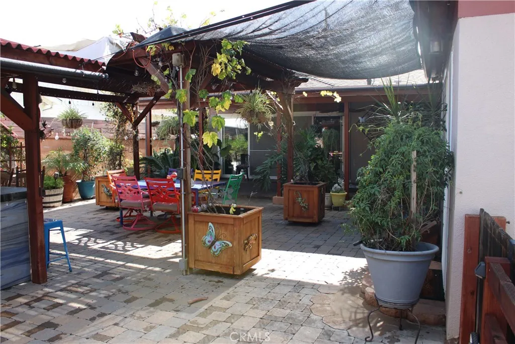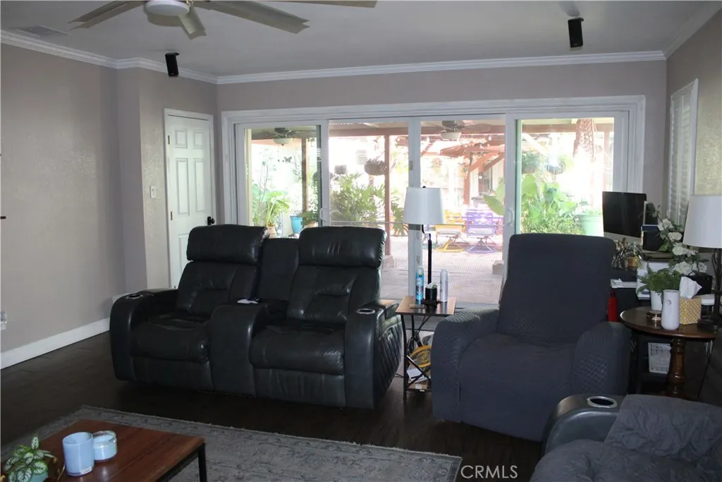 Updated contemporary North Ontario corner-lot home featuring 3 bedrooms and 2.5 baths and no HOA. Inside, youll find both a formal dining room and a cozy eat-in kitchen with a butcher-block island and tiled floors. The kitchen is enhanced with quartz countertops, a farmhouse sink, microwave, and dishwasher. Ceiling fans are installed in every room for added comfort, and all bedrooms offer natural wood flooring. Both full bathrooms feature glass walk-in showers, and the primary bedroom includes a sliding glass door with direct access to the backyard. Enjoy two fireplacesone in the living room and another in the spacious entertainment room. The entertainment room also opens through a sliding glass door to a beautifully maintained yard. The landscaped backyard includes orange and lemon trees and automatic sprinklers in both the front and back yards. The fully enclosed backyard, secured with an electric gate, provides ample space for RV storage and includes a Tuff Shed for additional storage. Spend evenings under the pergola or in the covered outdoor kitchen. This home also features a security monitoring system that captures the entire outdoor area.