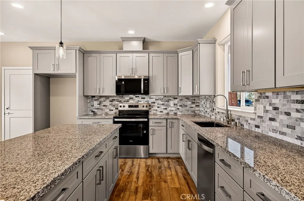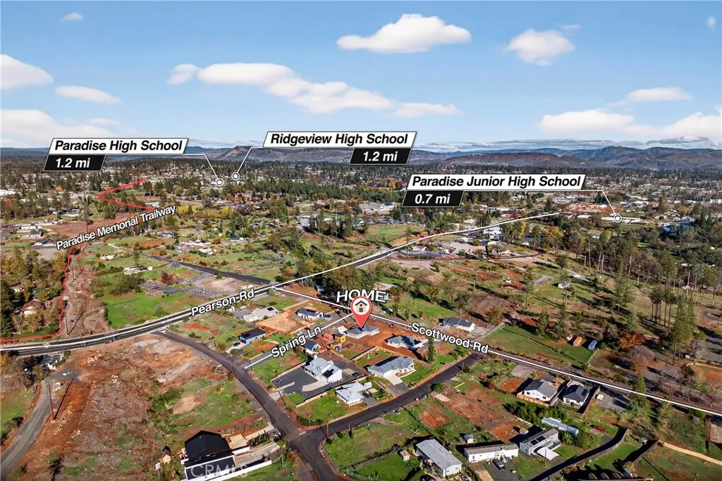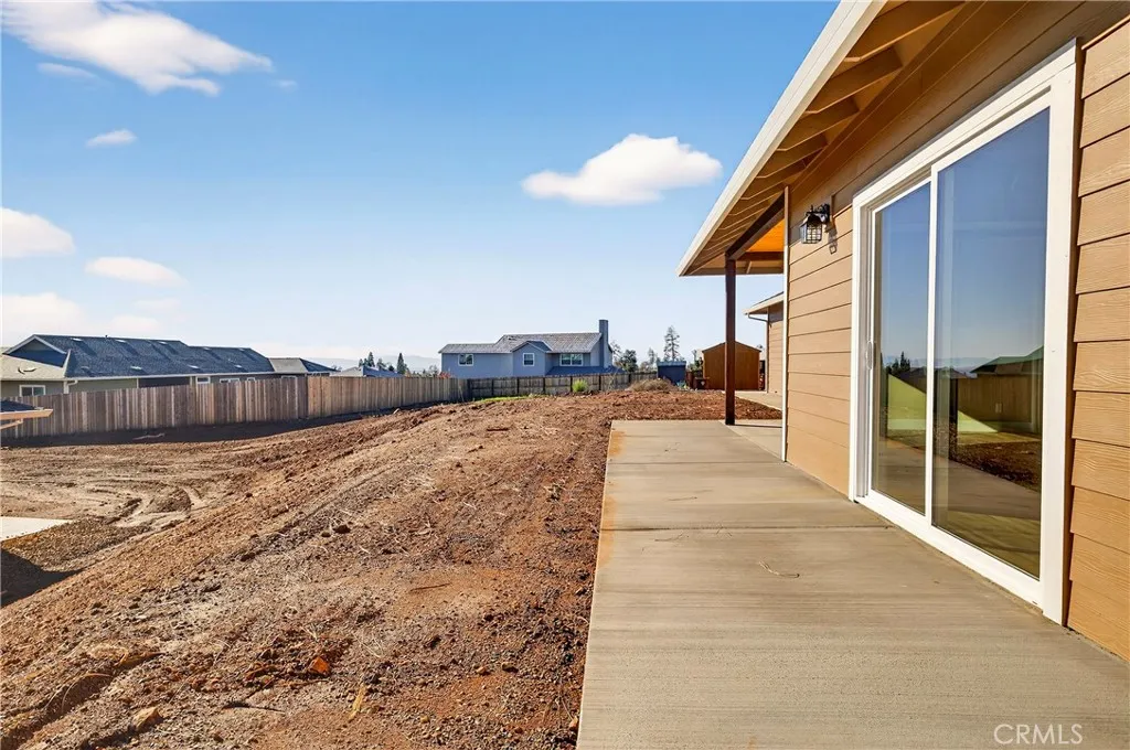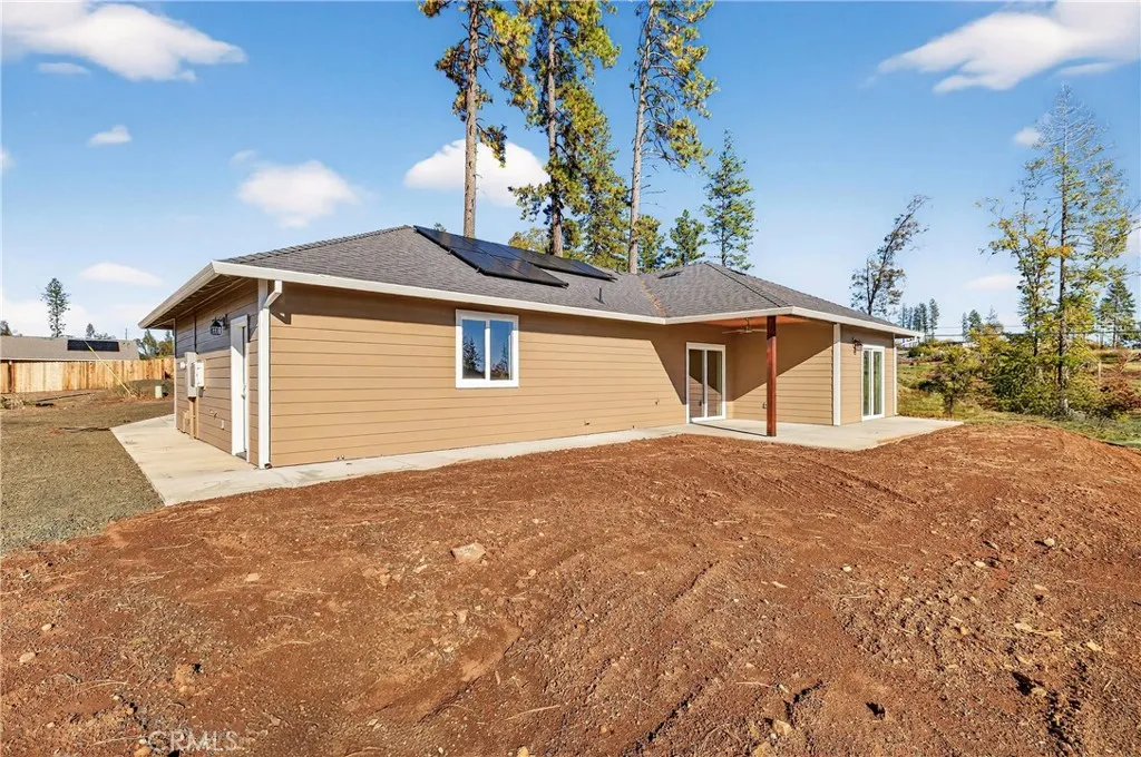 Fantastic Central Paradise location for this 2025 Custom Home, built by Frost Construction a long time Paradise builder. The home offers Owned Solar 3.08 KW system, 7 panels with microinverters. The .32 Acre lot offers space for Boat, Trailer or R.V. parking with electricity. Landscaped front yard on drip system. Boasting a generous 1,021 square feet of living space, this home features top-notch craftsmanship and modern amenities. Upon entering, you'll be greeted by a charming 96 square foot covered front porch with a craftsman-style front door and custom shutters. Step inside to discover an open floor plan that seamlessly connects the living room, kitchen, and dining area. The kitchen is a chef's dream with granite countertops, stainless steel appliances, recessed LED and pendant lighting, and a stylish island for added convenience. The primary bedroom is a serene retreat with crown molding, a slider leading to the covered patio, and a well-appointed en-suite bathroom featuring granite counters and a step-in shower. The guest bedroom also offers crown molding and access to a sleek guest bathroom with granite countertops and a tub/shower combination. The home features gorgeous Vinyl Plank flooring throughout. Outside, you'll find a spacious 114 square foot covered patio with recessed lighting and a ceiling fan, perfect for outdoor entertaining. Additionally, the oversized two-car garage, measuring 23'5" wide by 25'10" deep, includes a laundry area. Plenty of space for a boat, trailer, or RV parking. R.V. electric hook-ups. Don't miss out on the opportunity to call this beau