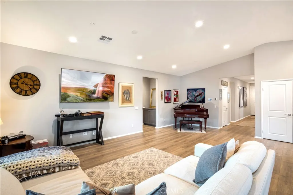 Turnkey and truly move-in ready! This impeccably maintained single-level home in the highly sought-after Audie Murphy Ranch community offers 3 bedrooms plus a versatile office/den with the option to convert into a 4th bedroom and 3 full bathrooms. Enjoy wide hallways, an open-concept layout, upgraded flooring, new paint, custom window shades, recessed lighting in every room, an abundance of natural light throughout. Keep cool and costs low in the summer with the energy efficient whole house fan, solar, smart thermostat and compatible devices. The kitchen opens seamlessly to the living and dining areas, creating the perfect space for gathering and entertaining. Step outside to a landscaped front and backyard complete with a covered patio with lighting and fans, gas fire ring, and additional seating areas, ideal for refined outdoor dining and year-round gatherings. Audie Murphy community living and recreation with pools, bbq, games, fire rings, parks, sports fields, scenic walking trails, award winning Menifee schools, and more. All in a prime location with unbeatable access to both the 215 and 15 freeways. Convenience and comfort are right at your doorstep!