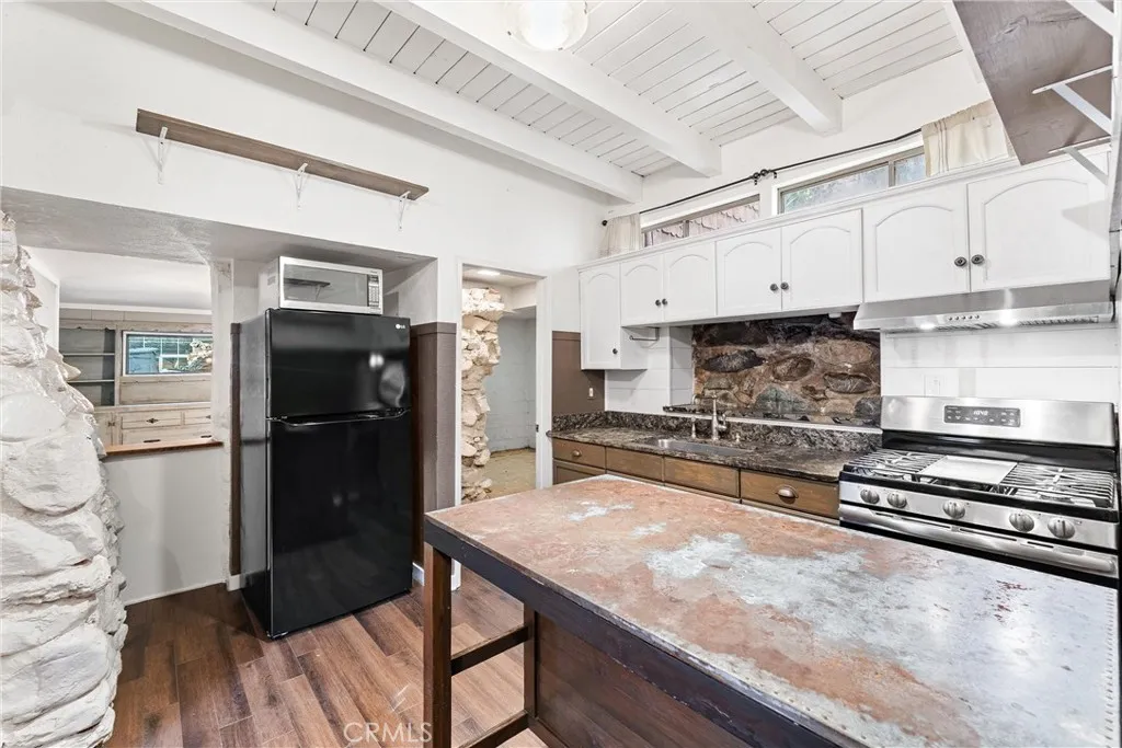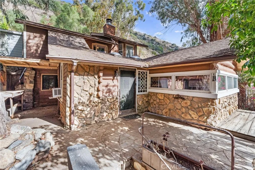 28751 Sycamore Drive, Silverado, CA 92676 is a rustic canyon retreat in the heart of Silverado Canyon, just minutes from Irvine, Foothill Ranch and the 241 Toll Road. Surrounded by mature trees, a seasonal creek and terraced outdoor spaces, this home offers a rare blend of nature, privacy and access to Orange County job centers and amenities. Per the assessor, 28751 Sycamore Drive is recorded as a 2 bedroom, 1 bathroom home. In addition to the two designated bedrooms, the property includes additional finished spaces that can function as a den, home office, studio or extra sleeping quarters, giving buyers flexible options for multi-use living, work-from-home needs or hosting guests. A wood and iron entry gate leads to a welcoming courtyard and elevated front deck with canyon views, a producing orange tree and space for lounging, grilling and outdoor dining. Inside, the main level features a spacious living room with high ceilings, log-style walls, hardwood floors and a wood-burning fireplace that creates a true cabin ambiance. A separate dining area with built-in buffet and stone accent detail connects easily to the remodeled kitchen, which offers white cabinetry, granite counters, an industrial-style center island and an adjacent utility / pantry room with full-size laundry. The main floor bedroom is wrapped in windows and includes a vintage built-in dresser, while the updated main-level bathroom has an exterior door for quick access to the side yard, pet area or garden. Upstairs, the additional finished areas provide multiple layout possibilitiesideal as a den, office, cre