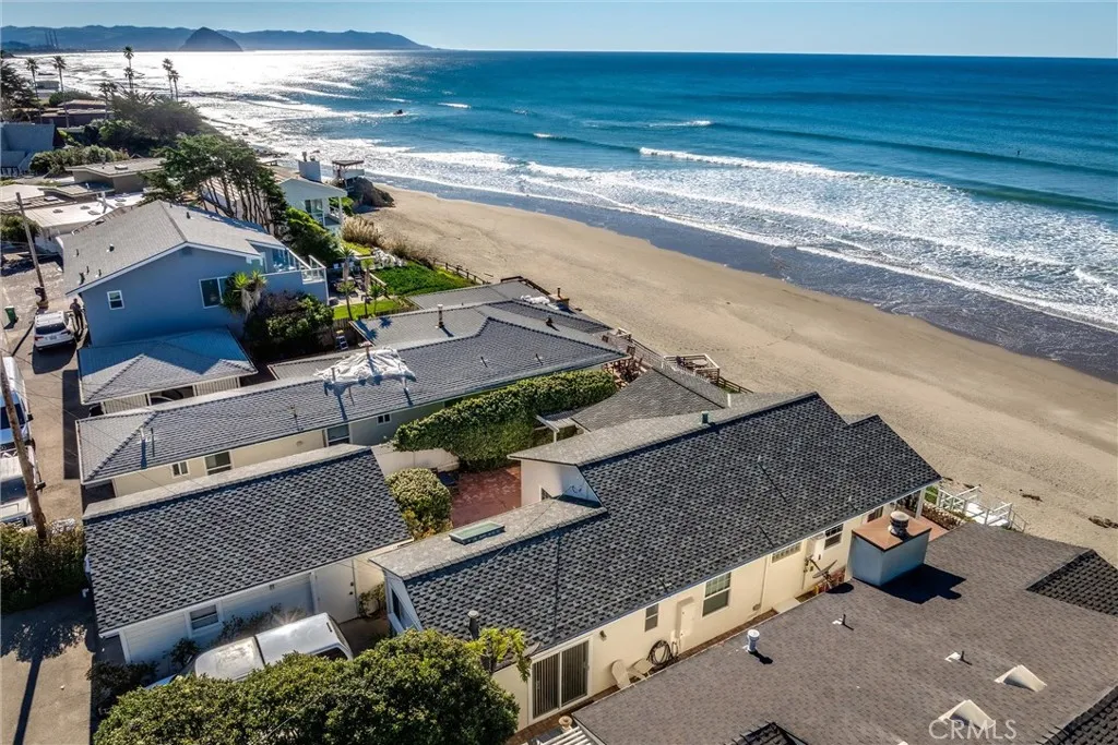 Rare oceanfront offering. This distinctive two-lot parcel comprises approximately 7,400 square feet, with 50 feet of ocean frontage and over 145 feet of depth. Situated closer to the bluff edge than neighboring residences, the property enjoys sweeping point-to-point coastline views and dramatic white-water vistas, enhanced by offshore rock formations. A set of finely crafted private stairs descends through an ice plantcovered bluff to a broad sandy beach below. The property includes a street-side two-car garage with additional storage, along with separate guest quarters, offering flexibility for visitors, extended family, or private accommodations. Beyond the garage is a sheltered interior patio well suited for container gardening, a spa, or outdoor entertaining. The main residence is accessed from the patio and opens into a full-width great room featuring vaulted ceilings, expansive glass, and an open-concept living, dining, and kitchen area. Wood flooring and detailed ceiling insets contribute warmth and architectural interest, while ocean views are enjoyed throughout the primary living spaces. The main living area includes a fireplace, ceiling fan, and a stackable washer/dryer discreetly located in a living room closet. The efficient kitchen is appointed with granite countertops, updated cabinetry, and stainless steel appliances. The dining area is highlighted by an arched window and plank-style ceiling. The main residence offers two bedrooms with ample natural light, including one generously sized to accommodate twin beds, along with a full bathroom featuring a pedestal