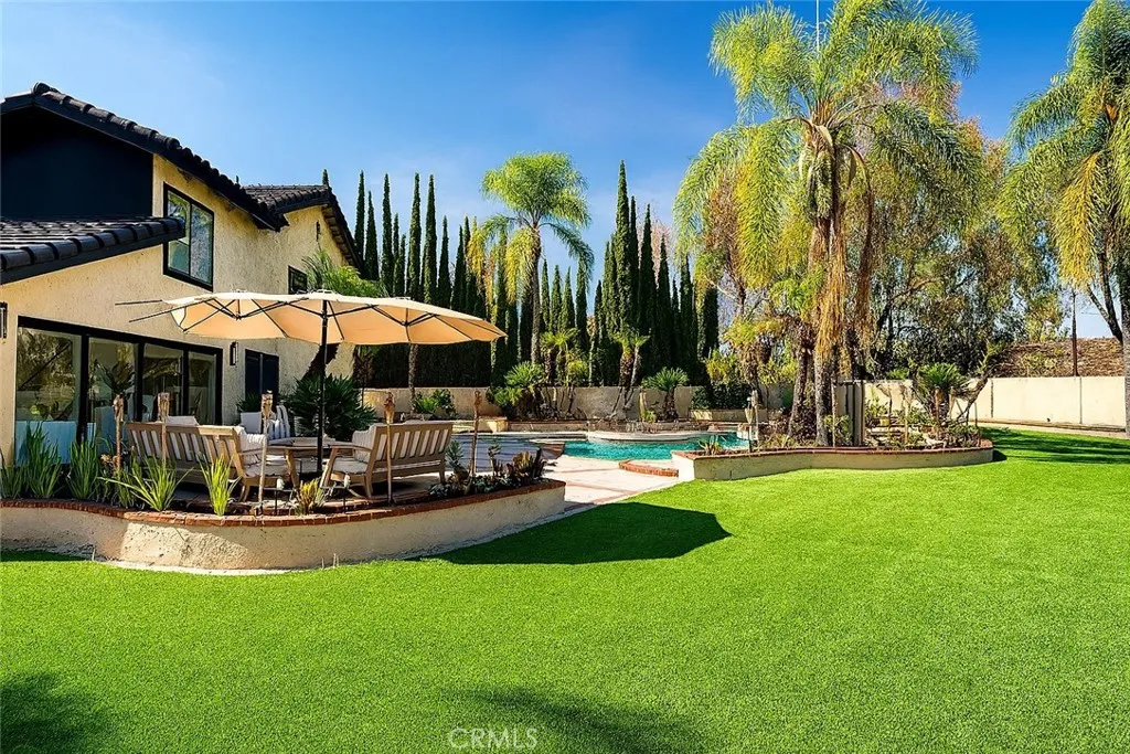 Welcome to your dream home! Nestled on a generous 13,000+ sq ft lot, this open concept residence with a pool & spa offers a rare combination of spacious luxury, modern upgrades, and resort-style living. Featuring 4 bedroomsincluding two expansive master suitesand 3.5 beautifully updated bathrooms, this home is thoughtfully designed to accommodate both families and entertainers alike. Upon entry, you are greeted by white marble flooring throughout the main level, a striking black marble TV wall with a built-in electric fireplace that adds contemporary elegance to the main living space. Step inside a chefs dream kitchen boasting high-end Dacor appliances, push-to-open custom cabinets with pull-out drawers, accent lighting, and an extra-large quartz stone island, providing both style and function. Enjoy additional luxury touches including a modern wine bar under the staircase, water-resistant laminate upstairs, and recessed ceiling lights that create a bright and welcoming ambiance in every corner of this home. The oversized glass sliding doors lead to your private backyard oasis, complete with lush tropical landscaping, swaying palm trees, a spacious swimming pool with a tranquil waterfall, and a relaxing jacuzzi. The expansive yard offers incredible versatility, with ample room to add a pickleball court, basketball court, or even build an ADUideal for multigenerational living or investment purposes.The front yard is fully remodeled with brand new turf, decorative white stones, and a water feature, ensuring beautiful curb appeal year-round. Dont miss this rare opportunity to