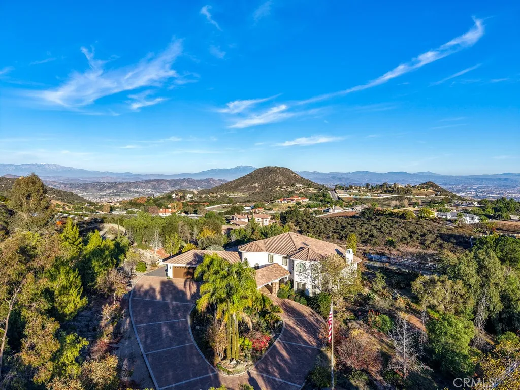 Stunning La Cresta Estate with Panoramic Valley, City-Light & Mountain Views Perched on just over five fully fenced acres, this exceptional custom La Cresta estate offers breathtaking views of the Temecula Valley, city lights, and surrounding mountains. A dramatic stone and wrought-iron gated entry leads to an expansive circular paver driveway, porte cochre, and elegant valet-style entrance. Inside, a grand foyer with soaring ceilings opens to an expansive great room featuring a fireplace, built-ins, and walls of windows framing the spectacular scenery. The open-concept layout includes a formal dining room, sunny breakfast nook, and a well-appointed kitchen with large island, built-in refrigerator, ample storage, and ideal for both entertaining and everyday living. The main-level primary suite offers a walk-in closet, dual vanities with makeup area, soaking tub, and spacious walk-in shower. Also on the main floor are a large office with closet, powder room, full bath, and an oversized laundry room with chute. Upstairs, a sweeping curved staircase leads to a secondary primary or junior suite with ensuite bath, two additional bedrooms, a full bath, and a light-filled bonus room/library. Outdoor living is equally impressive with covered patios, manicured grounds, fruit trees, walking paths, and a grassy area with room for a pool. At the highest point of the property, a viewing platform captures unforgettable 360-degree views and star-filled skies. Equestrian amenities include a large breezeway barn with three in-and-out stalls, tack room, workshop, paddocks, round pen, wash st