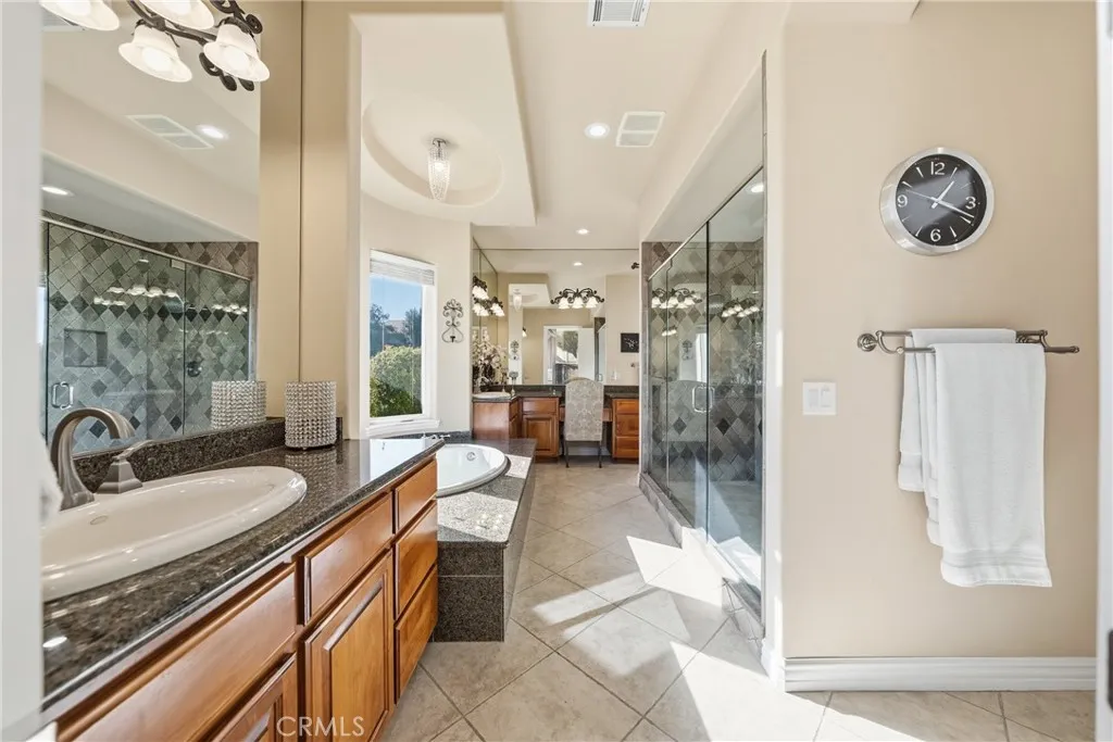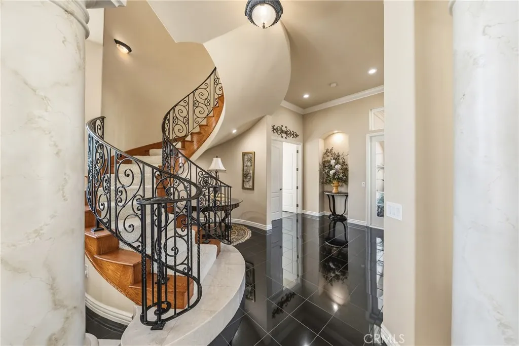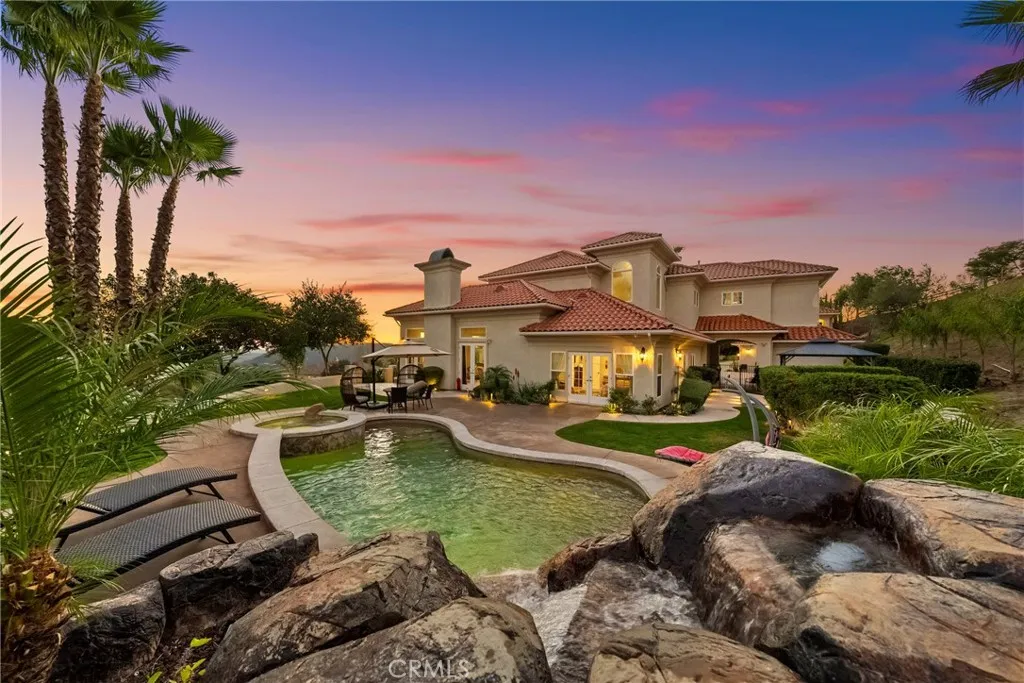 A breathtaking luxury estate in the prestigious gated Renaissance Estates community where timeless architecture converges on five acres and over 7,000 square feet of living space. Masterfully built, this residence has panoramic picturesque views of surrounding hills and valleys, tranquility and privacy. Experience high-end living, impeccably maintained landscapes, and various fruit trees, creating an atmosphere that elevates daily living just minutes from Old Town Temecula. The main residence welcomes you through glass double doors and cathedral ceilings with clerestory windows, illuminating the living room with Temeculas stunning sunrise. Downstairs unveils a unique theater space and a ready-to-install elevator that makes this home stand out from all the rest. A formal dining room with a fireplace is adjacent to the gourmet kitchen that includes a center island with granite countertops, wine rack, butler's kitchen, high-quality milled wood cabinetry, reverse osmosis water system, and top of the line Bertazzoni six burner stove top with electric griddle. In the right wing, youll find the primary spa-like suite, which includes a jetted tub, double vanities, oversized closets, and double doors leading to the sweeping terrace overlooking majestic hills. The left wing offers another commodious guest suite with its own entry doors to the home. As you pass through corinthian marble pillars and walk up the grand staircase, youll find five spacious ensuite bedrooms with generous closet spaces, bathrooms, and a bonus room with built-in shelving. Additional home features include thir
