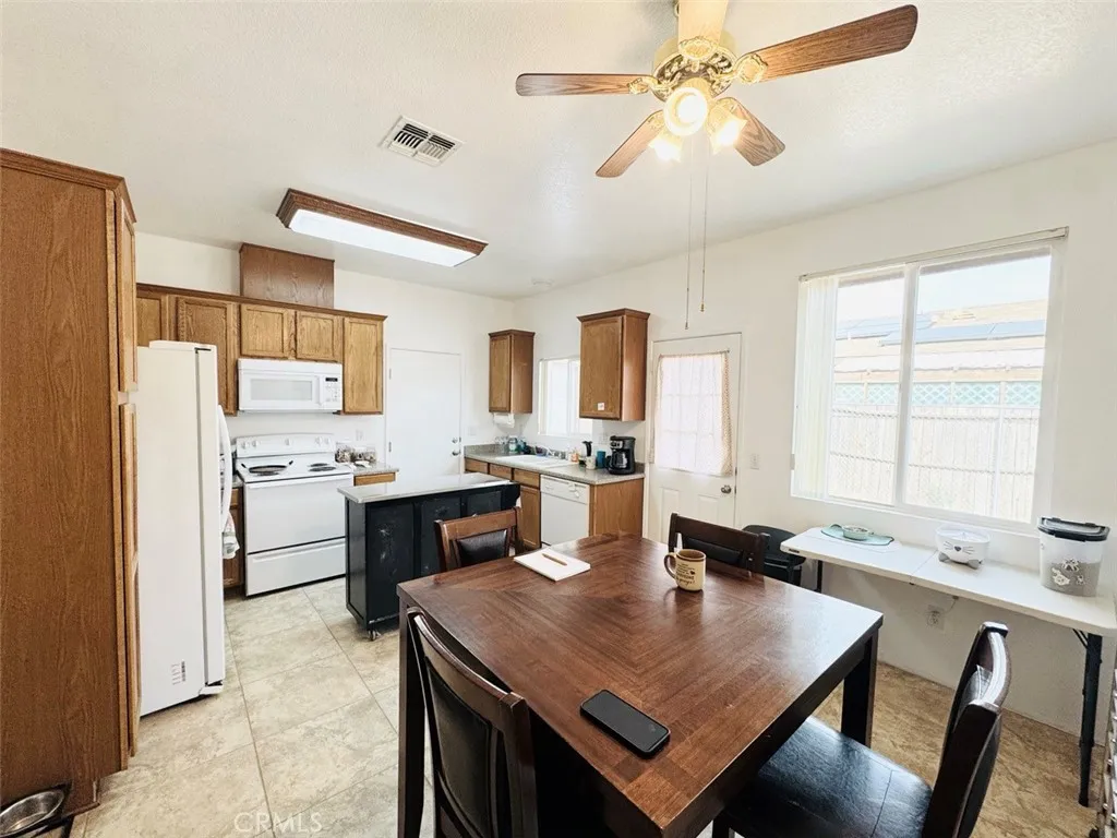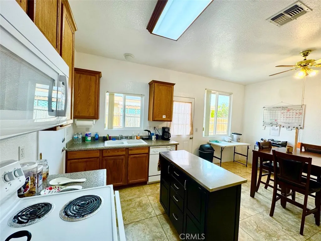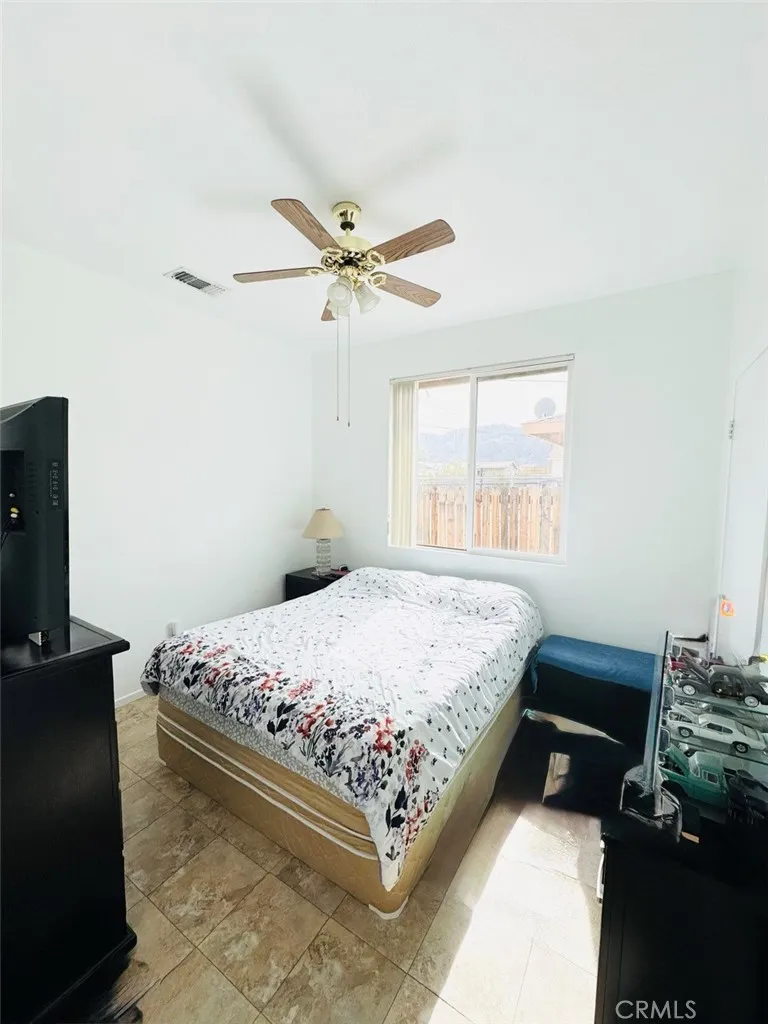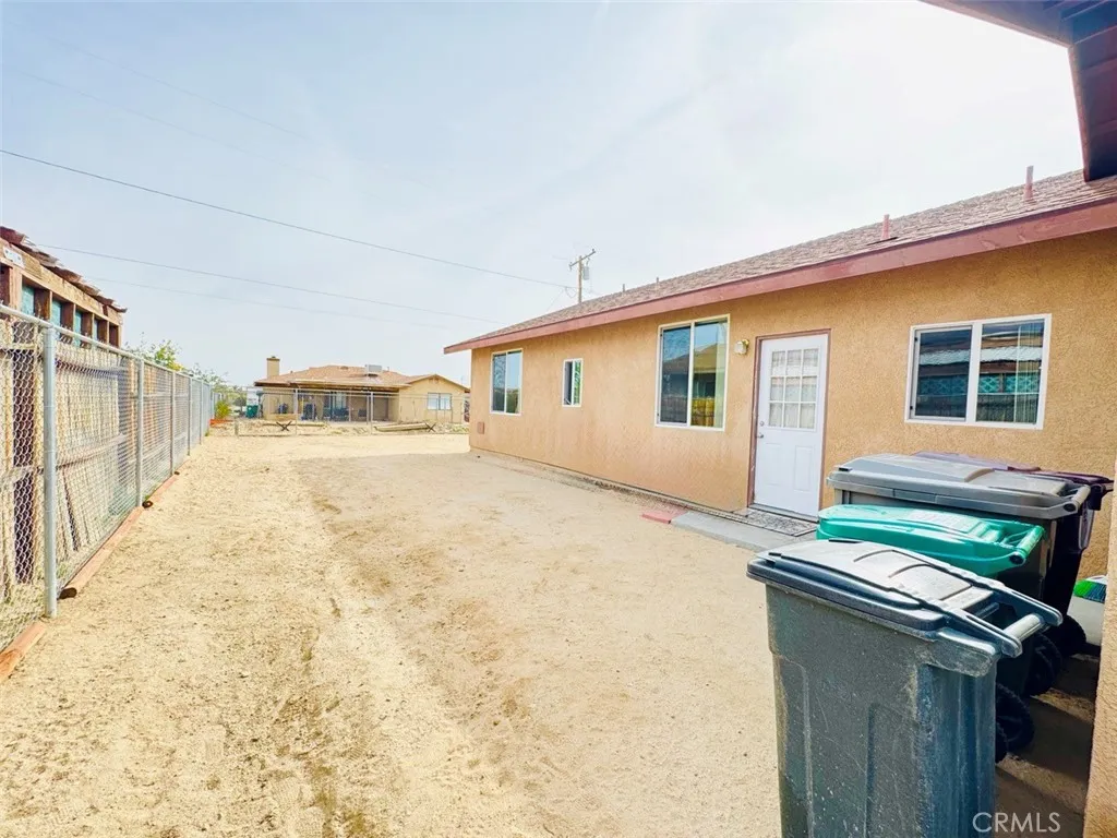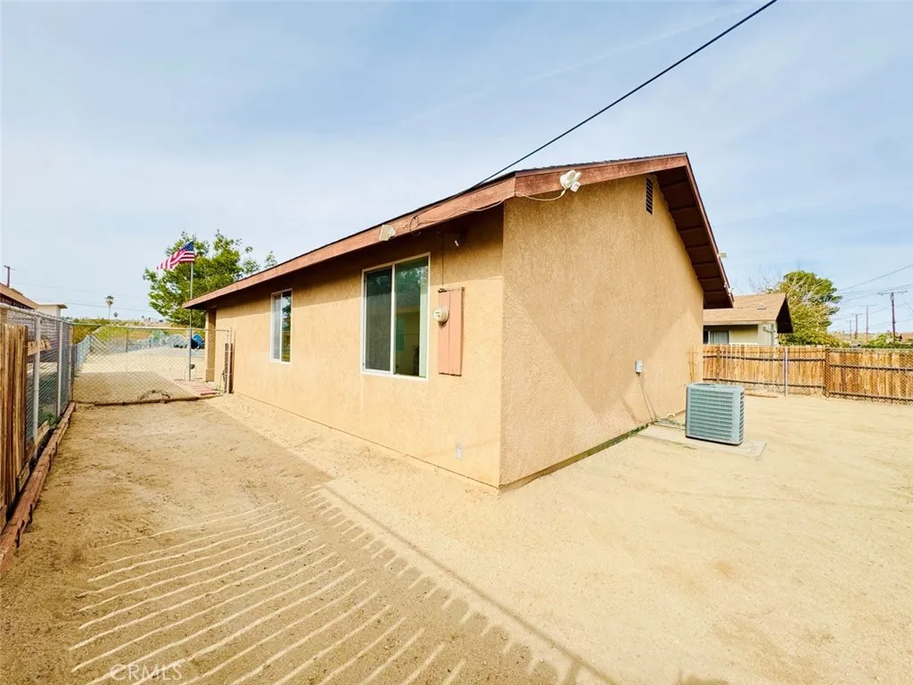 Discover this thoughtfully maintained 3-bedroom, 2-bathroom retreat, built in 2006. It boasts 999 square feet of efficient living space on a spacious 6,900 square foot lot in the tranquil Chocolate Drops neighborhoodyour gateway to exciting adventures in Joshua Tree. The open eat-in kitchen features terracotta tiles and cooling ceiling fans, creating a harmonious blend of style and functionality. Oak cabinets, white appliances, and a built-in desk nook provide ample workspace and a cozy dining area. A plush floral couch and a large TV wall mount anchor the flowing living space, making it an ideal spot for relaxation and entertainment. The two flexible bedrooms offer a range of options. One bedroom features a queen platform bed and nightstands, while the other serves as a creative office with desk storage. Both bathrooms boast crisp white fixtures and tub-shower combos, ensuring a refreshing and modern experience. Step outside to explore the expansive outdoor potential of this retreat. A chain-link fenced dirt yard with animal pens and mountain backdrops provides a perfect setting for hobbies or accommodating pets. A low-care front gravel area, mature trees, and convenient carport parking make it an effortless desert living experience. Buyer to independently verify all MLS information, including, but not limited to, permits, property use, bedroom/bathroom counts, square footage, school districts, and enrollment availability. Buyer is strongly encouraged to conduct their own investigations and inspections to confirm the accuracy of all information provided.
