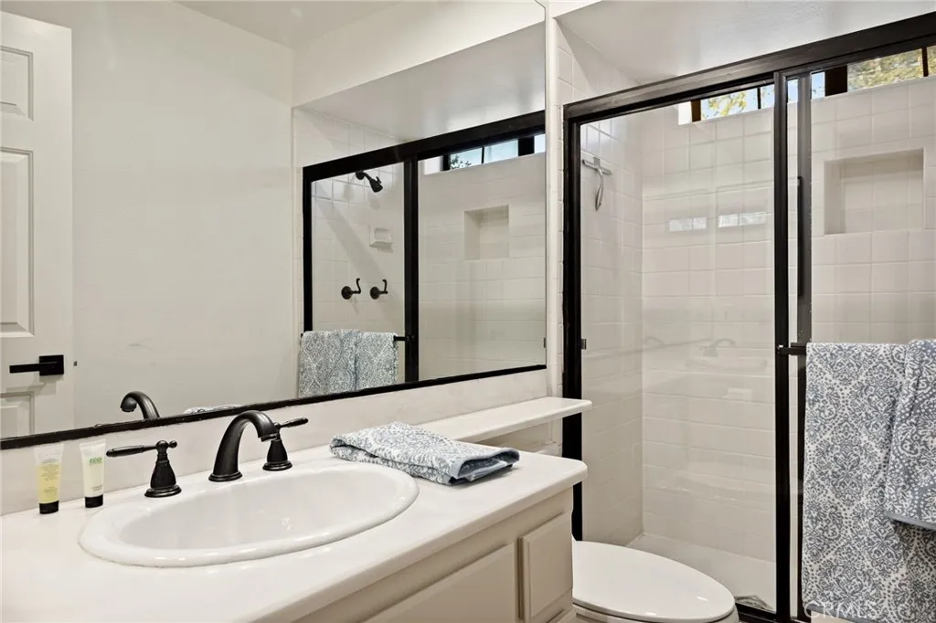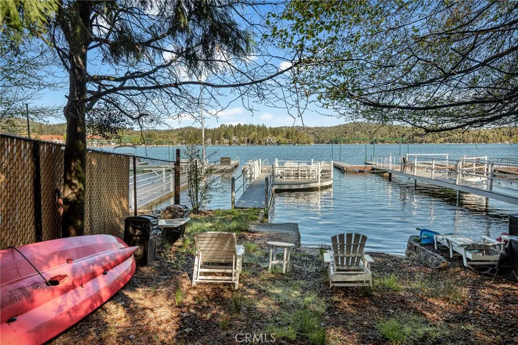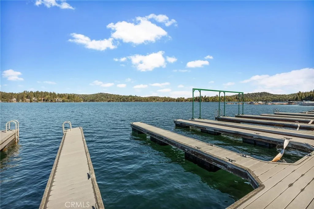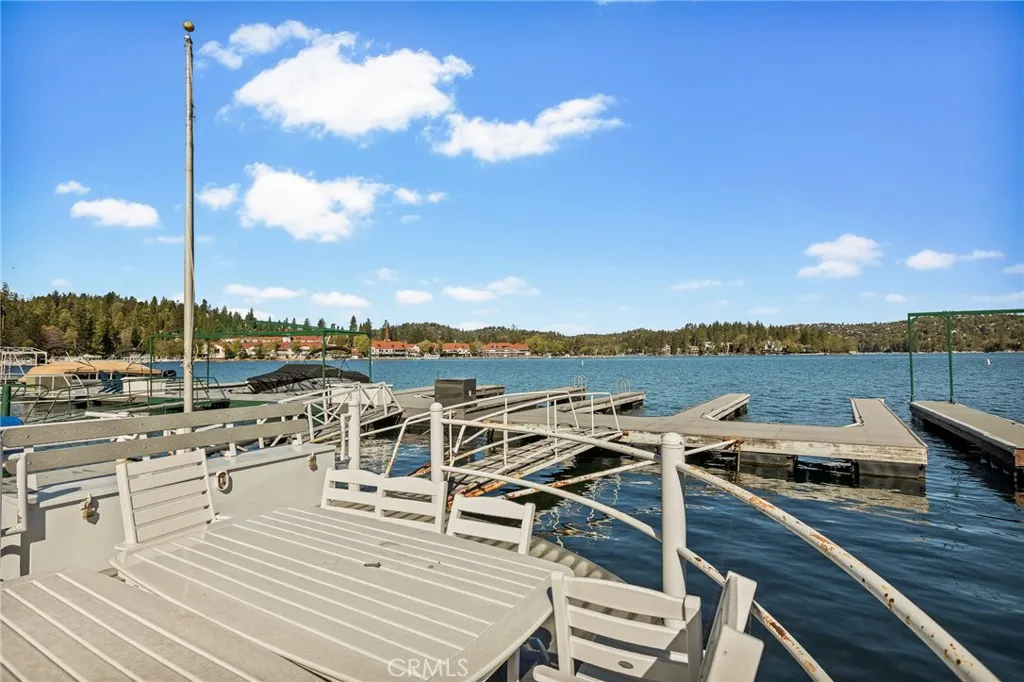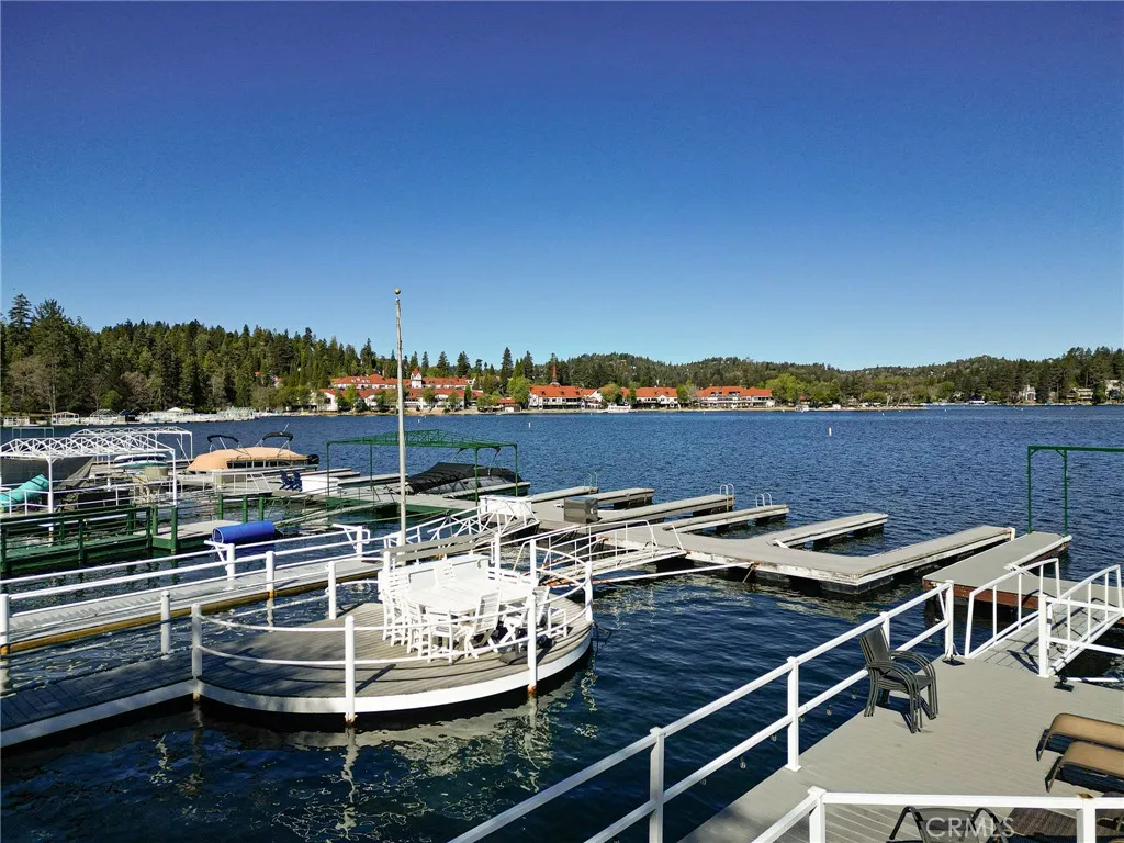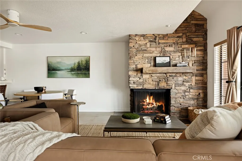 Experience refined lake living in the absolute heart of Lake Arrowhead Village, where the best restaurants, boutique shopping, lakeside concerts, coffee shops, wine bars, and seasonal events are just steps from your front door. This beautifully positioned waterfront condo offers the rare opportunity to live in the middle of it all while enjoying peaceful marina and water views from your own private balcony. Originally designed as a 3-bedroom residence, the home has been thoughtfully reimagined into a spacious 2-bedroom layout to create an expansive open-concept flex space currently used as a secondary lounge with a sleeper sofa, perfectly oriented toward the lake. The design enhances the natural light and sense of openness, while still offering the flexibility to easily convert the space back into a true third bedroom if desired. The main living area blends warmth and sophistication with wood flooring, a striking stacked stone fireplace, and large sliding glass doors that frame the water and open to a private balcony overlooking Village Bay. Morning coffee feels elevated above the trees, and evenings are best spent with a glass of wine while watching boats glide into the marina below. The kitchen flows seamlessly into the dining and living spaces, making it ideal for entertaining after a day on the water or dinner in the Village just a short stroll away. Both bedrooms are generously sized and designed for comfort and privacy, while the primary suite enjoys tranquil tree-top views. Covered garage parking and in-unit laundry add convenience, allowing you to park and truly emb