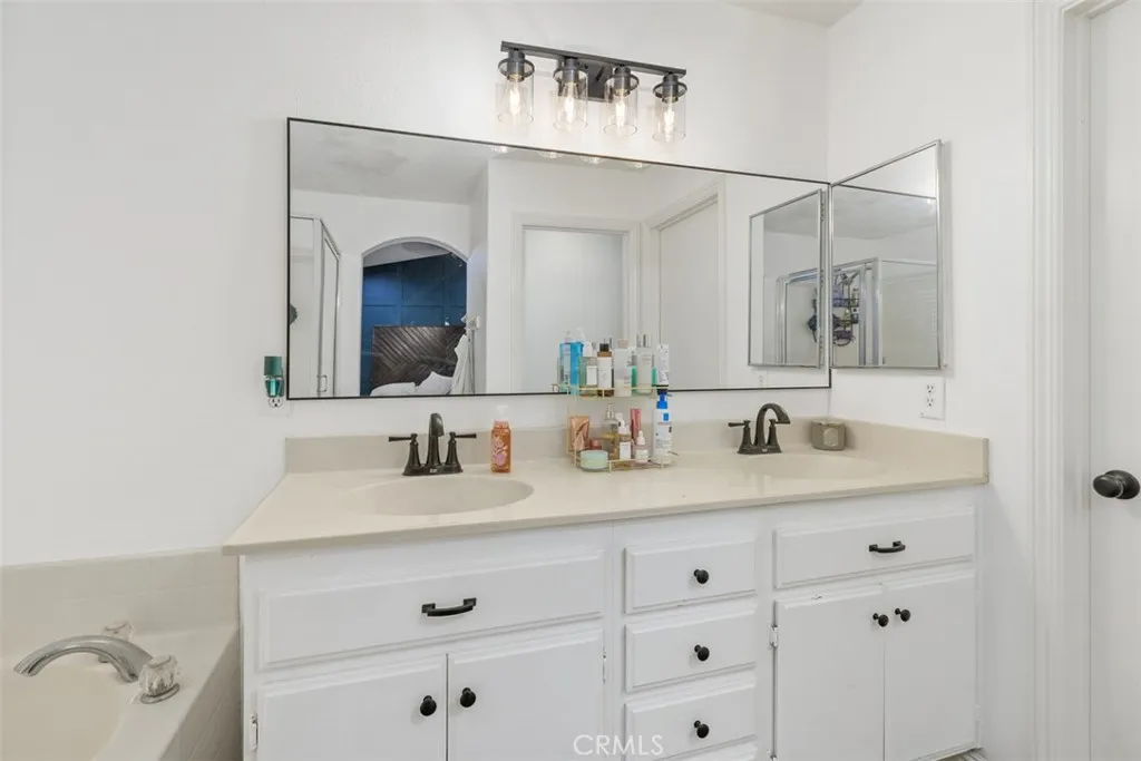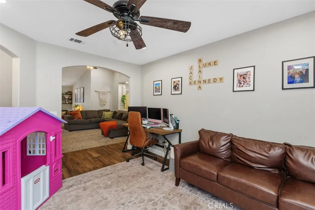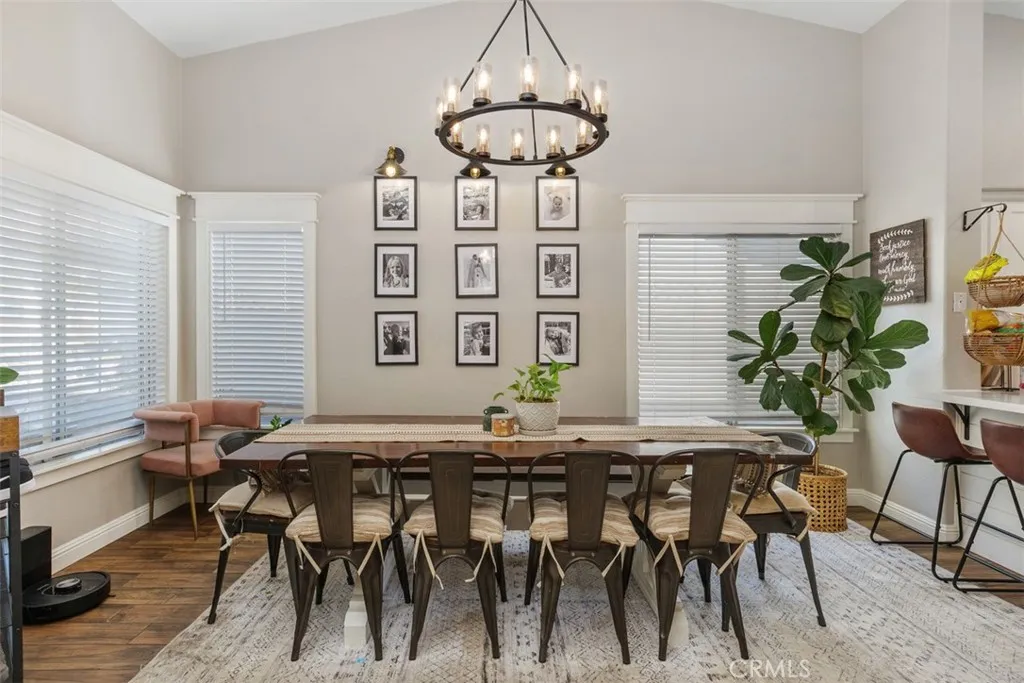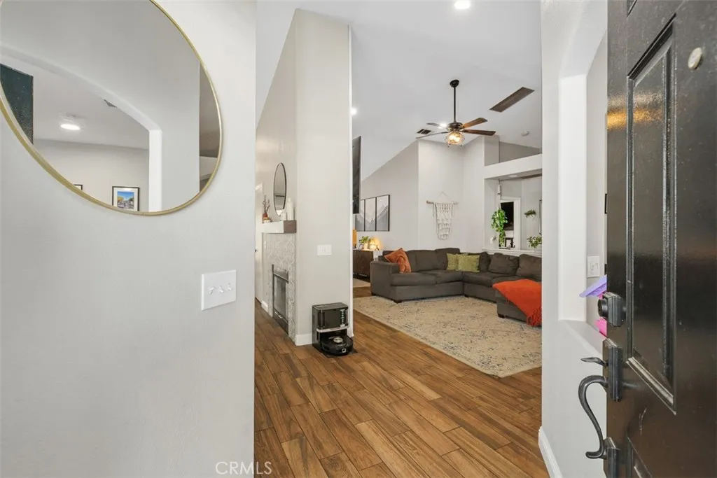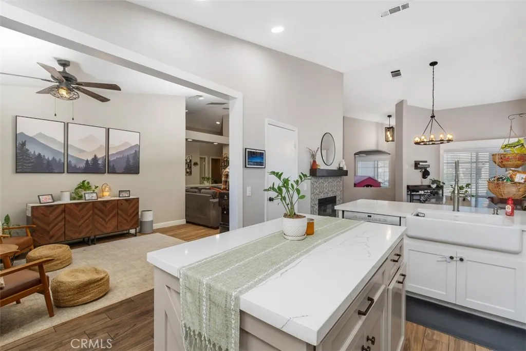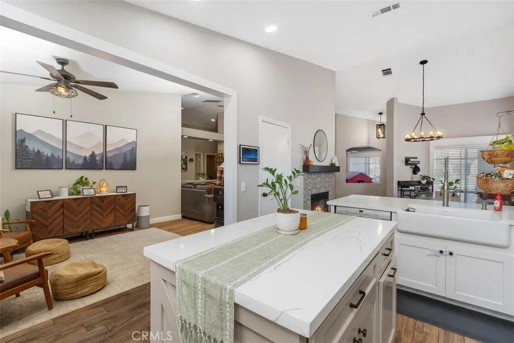 There is something incredibly comforting about a home that feels open, warm, and easy from the moment you step inside, and this French Valley beauty delivers that feeling immediately. Tall ceilings draw your eye upward, creating volume and light throughout the main living spaces. The openness of the design allows each area to feel connected while still maintaining its own sense of purpose. At the center of it all, a charming dual-sided fireplace adds character and cozy ambiance, serving as a beautiful focal point that naturally brings people together. It is the kind of feature that makes everyday evenings feel special and gatherings feel intimate. The kitchen has been tastefully updated with white cabinetry, quartz countertops, and stainless steel appliances, offering both timeless style and modern functionality. A well-placed center island enhances prep space and flow, while the bar seating at the sink becomes an everyday gathering spot that is perfect for morning routines, casual meals and lingering conversations. It is a layout designed for real life and real connection. Wood-look tile flooring runs throughout the primary living areas, blending warmth with durability for busy households. Upgraded baseboards add a clean, finished touch, and custom closet systems in the secondary bedrooms provide thoughtful organization that makes day-to-day living easier. Outdoors, the home continues to shine. A covered patio with a space heater and side shades creates a comfortable extension of the interior living space, ideal for weekend barbecues, relaxed evenings, or simply enjoying a