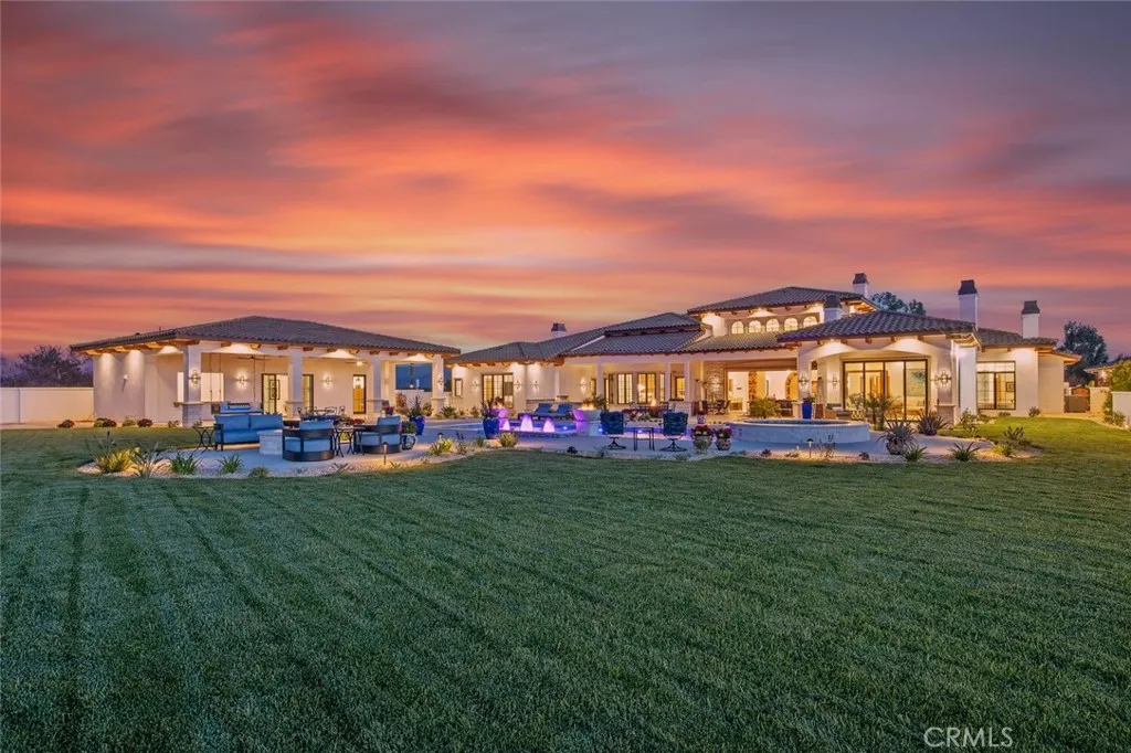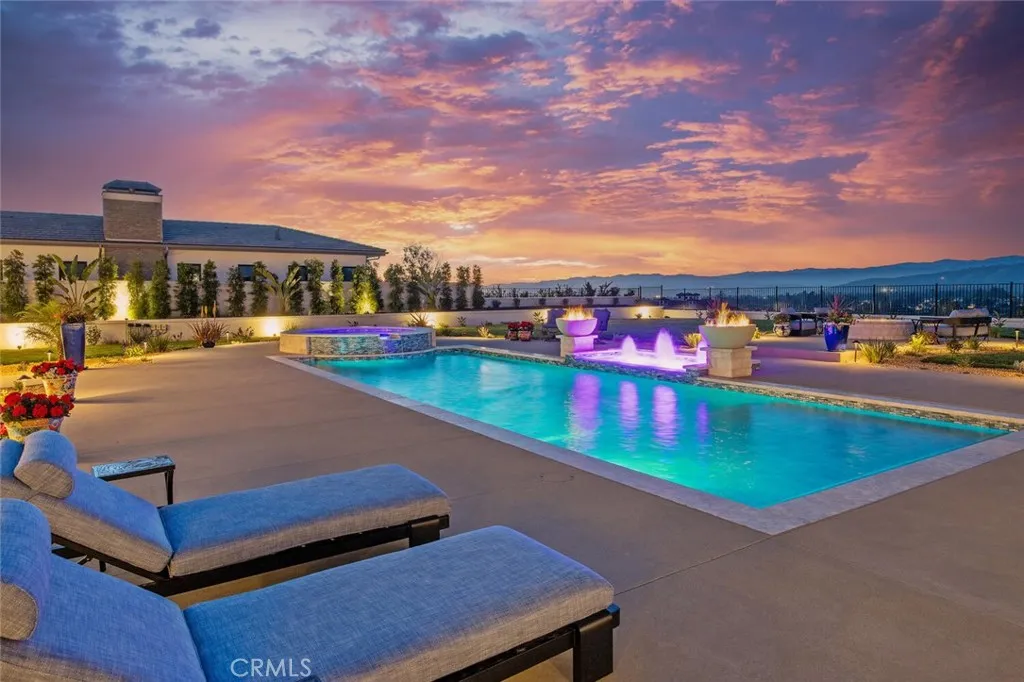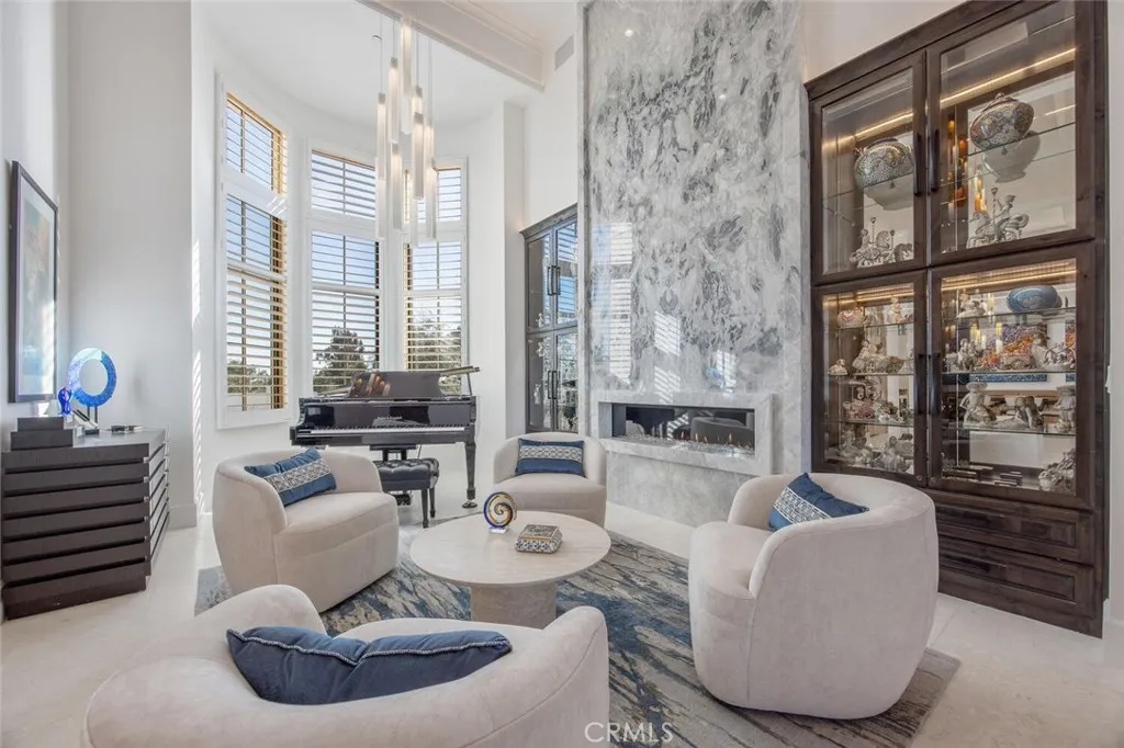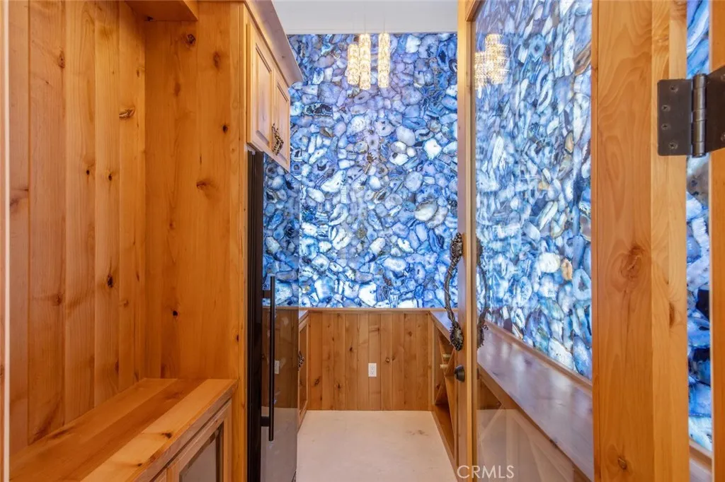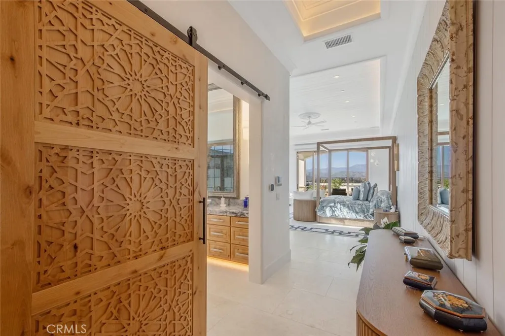 Completed in 2025, this single-story architectural residence is set on approximately one acre of gated grounds, blending panoramic views with refined design and resort-caliber living. A dramatic foyer introduces Turkish white limestone floors, hand-applied Venetian plaster walls, and a sculptural multi-tier chandelier. Beyond, the great room soars to 26-foot ceilings with a limestone fireplace and expansive 20-foot disappearing nano doors that dissolve the boundary between interior and exterior living. The turret-style living room is framed by 12-foot windows and anchored by a striking quartzite fireplace, while the formal dining room features custom built-ins and designer lighting. The chefs kitchen impresses with 156 ceilings, custom knotty alder cabinetry, dual navy-stained islands, quartzite countertops, premium appliances, and an adjoining circular breakfast nook. A fully equipped prep kitchen, Butlers Pantry, and concealed walk-in pantry ensure effortless entertaining. The wine room is a statement piece, clad in backlit gemstone slabs with custom alder racking and a 70-bottle refrigerator. A 50-foot gallery hallway leads to a show-stopping powder room and into thoughtfully designed private spaces, including a tiered theater with 140-inch screen and full bar, and a sophisticated study with quartzite fireplace and French doors opening to a secluded patio. Three secondary bedroom suites feature bespoke finishes and private baths, with one currently styled as a gym overlooking pool and mountain views. The primary suite is a retreat of its own, complete with fireplace, nan
