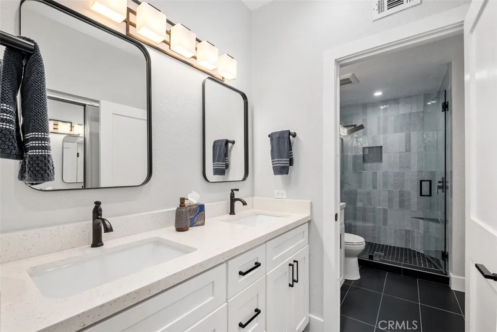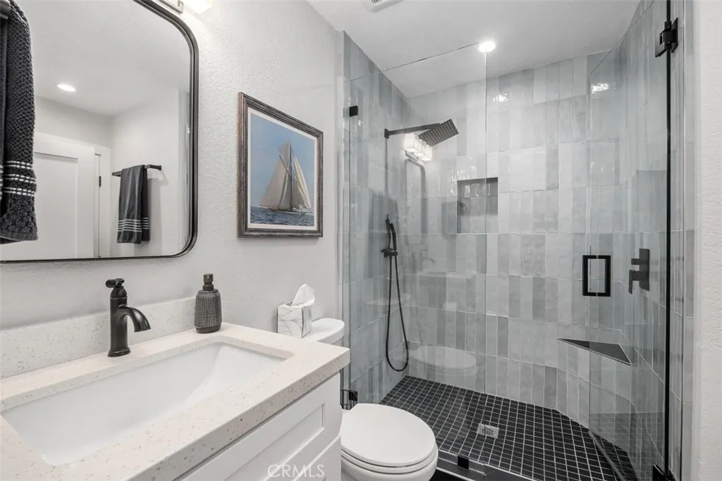 Prime Location! Recently completed top-to-bottom renovation! turn-key, ground-floor, single-level located in a quiet, community walking distance to fine dining and two shopping centers, coastal close with a refreshing ocean breeze. Spacious dining area easily used as office space/guest space. Community pool and spa. This open-concept home features newly replaced hardwood floors, updated interior/exterior doors and beautiful custom windows, recessed lighting throughout, and a two-way gas fireplace with bi-fold glass doors. Modern kitchen includes quartz countertops, custom cabinetry, bar seating, and recently updated appliances: 6-burner range, dishwasher, disposal, microwave, refrigerator, and interior stacked washer/dryer. Spacious primary suite offers a professionally designed custom closet. Bathroom features dual sinks plus a separate privacy room with vanity and step-in shower. Additional highlights include updated heating and central air systems, remote-controlled bedroom ceiling fan, and top-down/bottom-up remote shades in dining area with additional shutters, shades, and draperies throughout. Covered patio with room for BBQ and outdoor diningenjoy morning sun without harsh afternoon exposure. Attached garage with epoxy flooring and EV charger. Move-in ready and thoughtfully upgraded throughout!