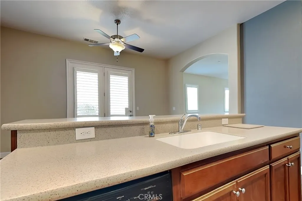 Welcome to Cottage Park gated senior 55+ community in Turlock! Beautifully upgraded 2BR/2BA model with excellent floorplan and over 1,400 SF. Incredible custom-installed security door at entry with amazing bronze finish. Updated designer interior paint and baseboards throughout. Large living room with beautiful luxury vinyl plank (LVP) flooring, ceiling fan, and custom plantation shutters. Kitchen with LVP plank flooring, solid-surface slab countertops with full backsplash, island with sink and breakfast bar, all built-in appliances (double oven, microwave, Bosch dishwasher, gas cooktop), abundant upgraded cabinets, LED recessed lighting, and large lighted pantry closet with built-in shelving. Adjacent formal dining area with LVP plank flooring, ceiling fan and awesome atrium french door to backyard patio. Hall bath with solid-surface vanity top, upgraded vanity cabinet and faucet, tub/shower with window, and LVP plank flooring. Secondary bedroom features upgraded carpet, good-sized closet, designer ceiling fan, and 2 windows with custom plantation shutters. Master bedroom with upgraded carpet and custom plantation shutters. Master bath features upgraded vanity cabinet, solid-surface vanity top featuring dual sinks with upgraded faucets, private toilet area, LVP plank flooring, large shower with integrated seating and clear glass doors, and adjacent lighted walk-in closet. Inside laundry room with LVP plank flooring, designer cabinets, amazing solid-surface counter top and LED recessed lighting. Other features include full extended-height ceilings, built-in fire sprinklers