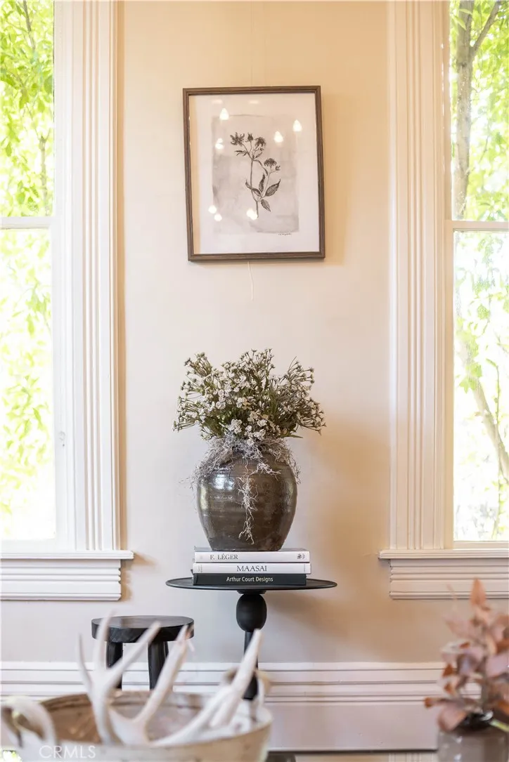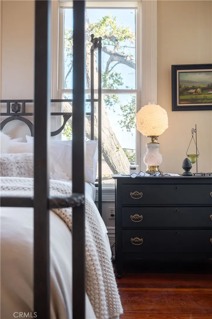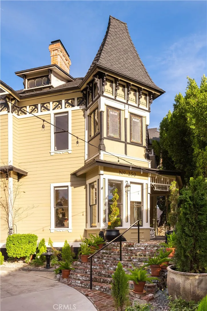 Step into a living legacy with "The Oaks," an extraordinary Southern California landmark that seamlessly marries meticulously restored Victorian grandeur with sophisticated farmhouse aesthetics. This rare offering presents a unique opportunity for stewardship, benefiting from a substantial property tax reduction of approximately 75%. Set behind a lush privacy hedge and finished entirely in rare, old-growth redwood, the residence unfolds across sixteen elegant rooms, many boasting soaring twelve-foot ceilings and five decorative fireplaces that anchor the homes historic soul. Visitors are welcomed through double doors with frosted panes onto a magnificent veranda, leading into a grand entrance hall where a stately fireplace serves as a centerpiece for the formal sitting area. The main level is designed for both grand-scale entertaining and intimate living. An expansive living room flows effortlessly into a sun-drenched parlor, while the private dining room evokes a bygone era of elegance with its original china cabinet and integrated dumbwaiter. The service wing houses a modern culinary suite featuring a 48" Monogram stove, side-by-side refrigeration, and a spacious pantry, alongside an office and a dedicated service porch. For added convenience, the main floor includes a luxurious en-suite bedroom featuring an updated bathroom with a dual-sink vanity and custom tiled shower. Architectural artistry reaches its pinnacle at the staircase, where a newel post surmounted by a lamp-lit sculpture enchantingly evokes the fairy queen from Shakespeares A Midsummer Nights Dream. The up