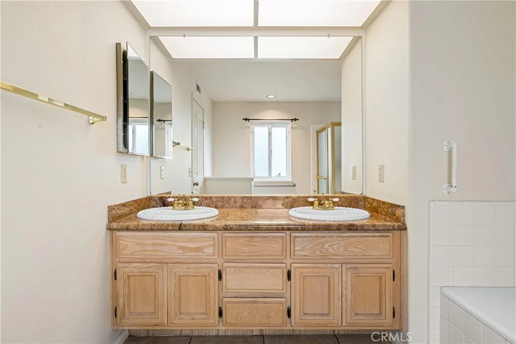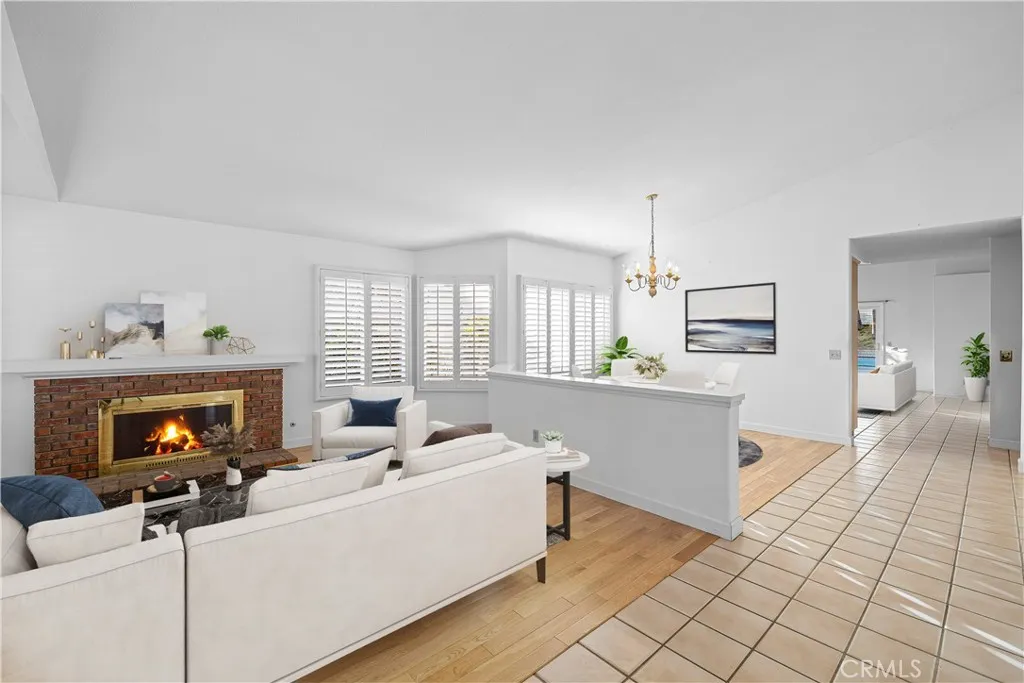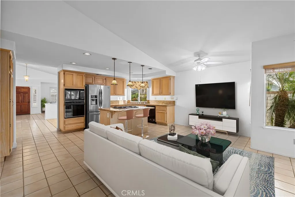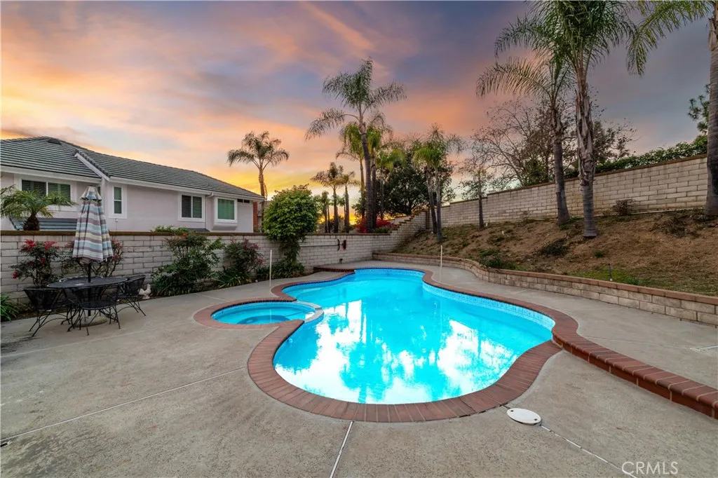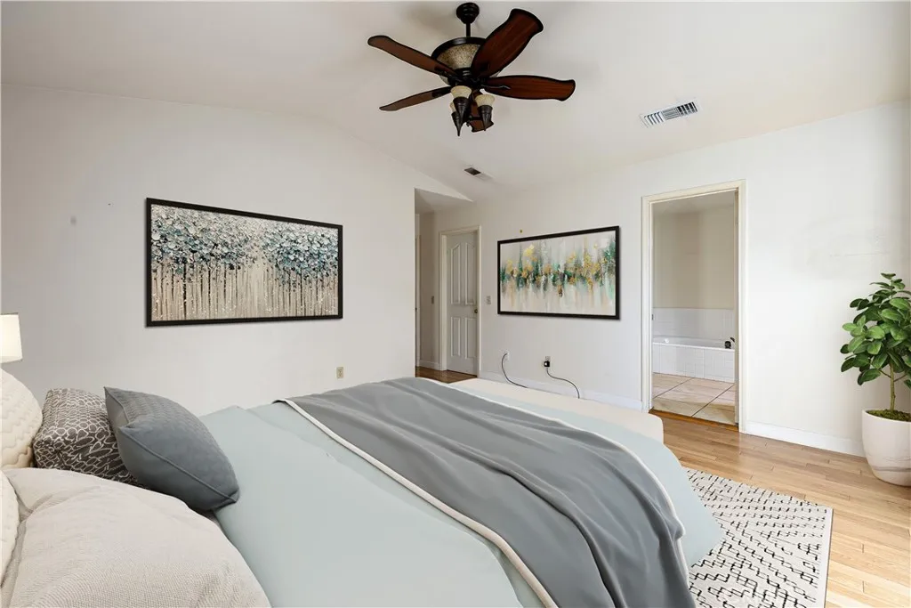 Single-story pool home located on a quiet cul-de-sac within the gated Emerald Ridge at Live Oak community. The front yard features a manicured lawn, brick ribbon walkway, brick planters, RV access, and a covered porch entry. The front door opens to a bright interior with vaulted ceilings and a tiled entry. The formal living room is positioned at the front of the home and offers hardwood flooring, a brick fireplace with mantel, and plantation shuttered windows, including a one overlooking the front yard. The adjacent dining room features a chandelier and additional shuttered windows with side yard views. The open kitchen includes wood cabinetry, granite countertops, and recessed lighting. A center island with cooktop, pendant lighting, and countertop seating connects the kitchen to the family room, which features vaulted ceilings, tiled flooring, and a sliding glass door providing direct backyard access. The primary suite offers vaulted ceilings with ceiling fan, hardwood flooring, a walk-in closet, and a spanning sliding door with plantation shutters opening to the backyard. The primary bath includes dual sinks with granite counters, a walk-in shower with glass enclosure, and a separate soaking tub. Two additional bedrooms feature wood flooring, vaulted ceilings, and spacious closets. A hall bathroom and a dedicated laundry room with cabinetry and backyard access complete the interior. The backyard offers a pool and spa with brick coping and concrete decking, a covered patio structure, a large grass area, RV parking with an extended side yard, mature landscaping, perimeter
