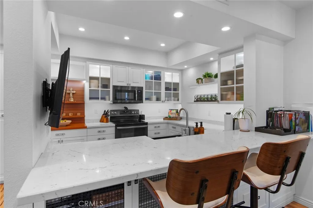 Located in the Heart of Encino, this Stunning Top-Floor Penthouse offers a Rare Combination of Chic Style & Convenience. This Unit is a Model-Perfect Residence that has been Extensively Upgraded to provide a Sophisticated, Turnkey Living Experience. The Home offers Soaring Cathedral Ceilings with an abundance of Natural Light Streaming through the Gallery-Style Dual Paned Windows. The Designer Kitchen is a Custom-Built Culinary Masterpiece featuring an Artisan-Designed Layout with Stone Countertops, Premium Stainless Steel Appliances, a Farmhouse Sink, Wine Refrigerator and Elegant Glass Cabinetry. The Unit has Gorgeous Wide-Plank Hardwood Floors that Flow throughout the unit. The Living Room includes a Wet Bar with a Wine Refrigerator, perfect for Entertaining, along with a Sliding Glass Door that opens to the Spacious Tiled Balcony making it an ideal spot for an Urban Garden or Sunset Dining. The Primary Suite offers a Serene Retreat with Vaulted Ceilings, Dual Sinks, Multi-Mirrored Closets and a Lavish Primary Bathroom with a Dedicated Dressing Area. The Unit also includes Central Heating/AC, Recessed Lighting, Plantation Shutters and tons of Natural Light. It also inlcudes 2 side-by-side Subterranean Parking Spaces with Additional Parking. Situated in the well-maintained "White Oak Encino" Complex, Residents enjoy a Resort-like Atmosphere with Lush Landscaping and Mature Trees. Amenities include a Sparkling Pool, Indoor Spa, Sauna & Recreation Room. HOA Perks: Dues cover Earthquake Insurance, Water, Trash and Common Areas Maintenance. The Complex is walkable to Ventura