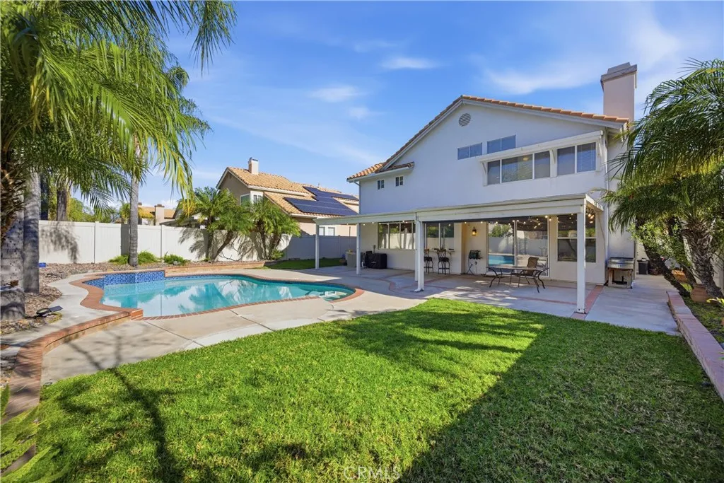 This 4-bedroom, 2.5-bath home offers 2,722 sq ft of living space, a private pool, and no HOA, creating a comfortable setting for both daily living and entertaining. Inside, the formal living room and separate dining room provide welcoming spaces for gatherings. The back of the home features a spacious family room with a fireplace that opens to the kitchen, allowing for an easy, connected flow. The kitchen offers generous counter space, a large window overlooking the backyard, and a pass-through counter to the covered patio. All four bedrooms are located upstairs, including a well-sized primary suite with dual sinks, a soaking tub, and a separate shower. The backyard includes a covered paved patio and pool, ideal for relaxing or hosting guests. Notable upgrades include vinyl plank flooring, fresh interior paint, new vinyl fencing, a new pool pump, new attic insulation, and fully paid solar with a new inverter. A 3-car garage adds functionality. Conveniently located minutes from the I-15 freeway, shopping, and dining, this home offers space, comfort, and accessibility.
