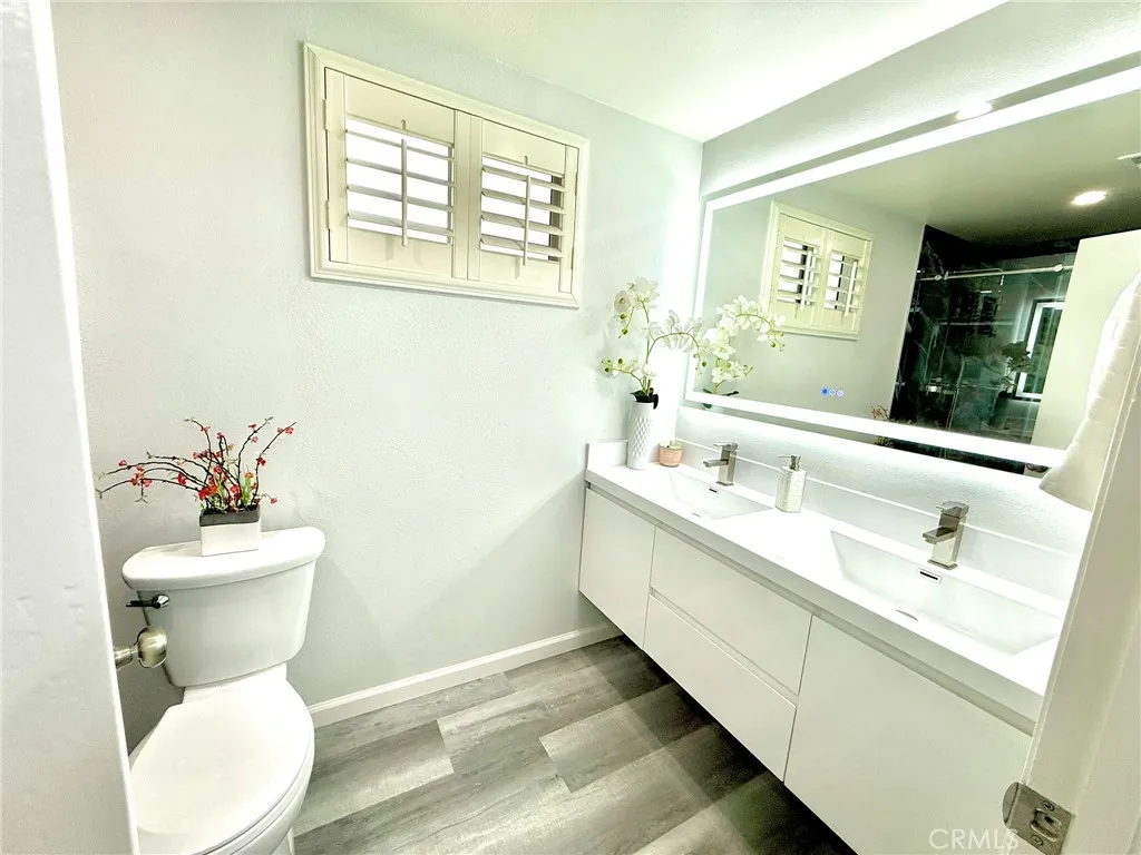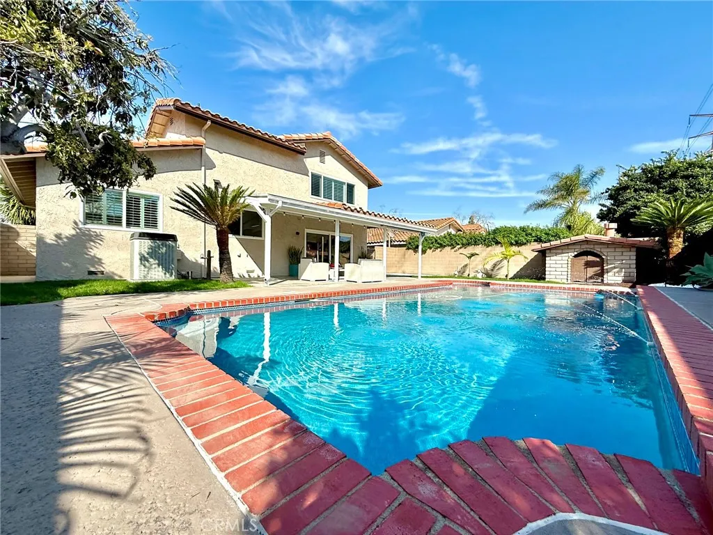 Welcome to this meticulously remodeled, two-level entertainers dream home, perfectly timed for summer enjoyment! Boasting over 2,000 square feet of elegant living space on a generous 6,849-square-foot lot, this 4-bedroom, 3-bathroom residence seamlessly blends modern sophistication with everyday convenience. A highly desirable main-floor bedroom and bath make it ideal for guests or multi-generational living. An impressive, oversized chocolate-cafe wood entry door with a decorative glass sidelight welcomes you into a sun-drenched interior, highlighted by a modern, geometric tiered crystal chandelier. The inviting living room features cathedral ceilings and recessed lighting, flowing naturally into a formal dining area. Neutral waterproof vinyl flooring runs throughout the entire home. The upgraded chefs kitchen showcases quartz countertops and comes fully equipped with a five-burner cooktop, range hood, dishwasher, and a premium 3-door Samsung Bespoke refrigerator with a beverage center. The cozy family room is anchored by a romantic fireplace, tastefully modernized with acoustic slat wall panels and integrated LED lighting. Sliding glass doors create an effortless indoor-outdoor flow to your private backyard oasis, featuring a sparkling pool with fountain and heated spa. Upstairs, the spacious primary suite includes a walk-in closet and a double-sink vanity with a frameless LED mirror. Two additional bedrooms are well-appointed, sharing a modern hallway bath. Additional features include a durable tile roof, covered RV parking, a two-car garage with direct interior access an