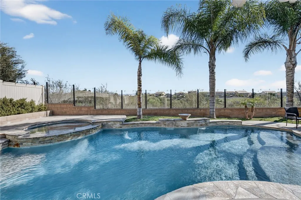 Welcome to your own private resort in the heart of Rancho Bella Vista! Situated on a rare double cul-de-sac with no rear neighbors, this beautifully upgraded 4 bedroom, 3 bathroom, 2,408 sq ft home offers privacy, views, and an entertainers dream backyard that truly sets it apart. Step outside and experience a backyard designed for unforgettable gatherings. The resort-style pool and spa with PebbleTec finish are complemented by a dramatic fire bowl, built-in fire pit, and a tiki bar complete with gas grill, under-counter refrigerator/kegerator, built-in TV, speakers, and ambient lighting. The authentic palapa-style thatched roofing creates the ultimate tropical vibe, while the full-length Alumawood patio cover provides shade and comfort year-round. The plexiglass rear fencing preserves breathtaking mountain views and open-space greenery, delivering complete privacy with no homes behind. A large side yard adds additional flexibility and functionality. Inside, the home continues to impress with a bright, open-concept floor plan and extensive upgrades throughout. The spacious kitchen features a large central island, granite countertops, custom backsplash, white cabinetry, double ovens, stainless steel appliances, and a huge walk-in pantry. Tile flooring runs throughout the main living areas downstairs, anchored by a cozy fireplace in the great room. Crown molding, plantation shutters, and LED lighting enhance the homes refined yet comfortable feel. The custom glass front door includes an operable panel, allowing refreshing cross-breezes throughout the home. The thoughtful layo