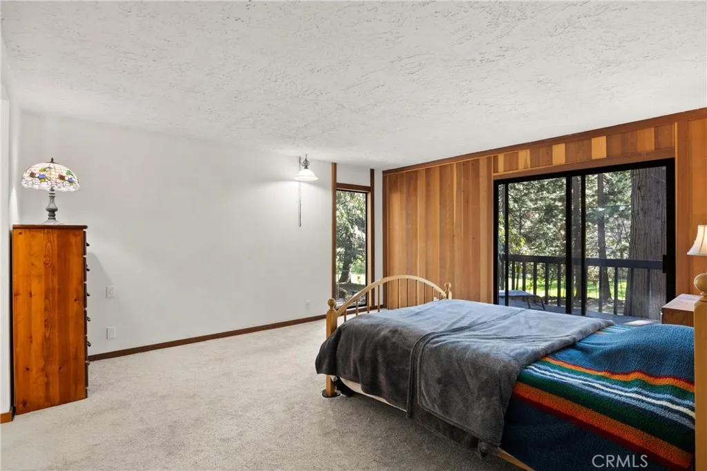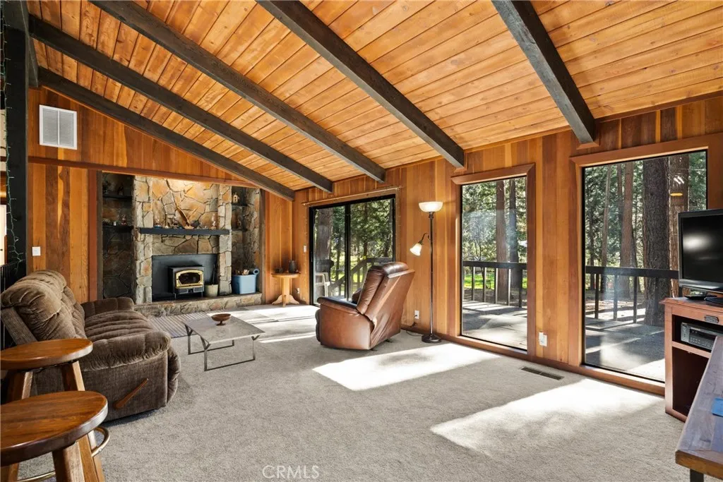 Nestled among the pines on a spacious .45-acre lot, this charming 2 bedroom, 2 bathroom home with an attached 2-car garage offers privacy, warmth, and a timeless cabin like feel. Inside, the inviting living area features beautiful tongue-and-groove ceilings with exposed beams, huge windows letting in tons of natural light, and a cozy wood burning stove with an inset stone hearth. The open living and dining spaces flow easily into the kitchen, offering tile countertops, electric cooktop, built-in oven, and additional utility sink, while overlooking the dining area. Down the hall is the guest bathroom, guest bedroom, and indoor laundry room. Located at the end of the home, the primary bedroom includes a slider with its own private deck, and attached bathroom. The en-suite contains 2 closets, a step-in shower, and large vanity area. Outside, enjoy the tranquility of mature trees, and multiple deck areas ideal for relaxing or entertaining. The attached two-car garage and large asphalt driveway provide ample parking, while double gates to the fully fenced yard allow drivable access to the backyard. A rare opportunity to own a peaceful retreat with classic architectural charm and room to enjoy nature.