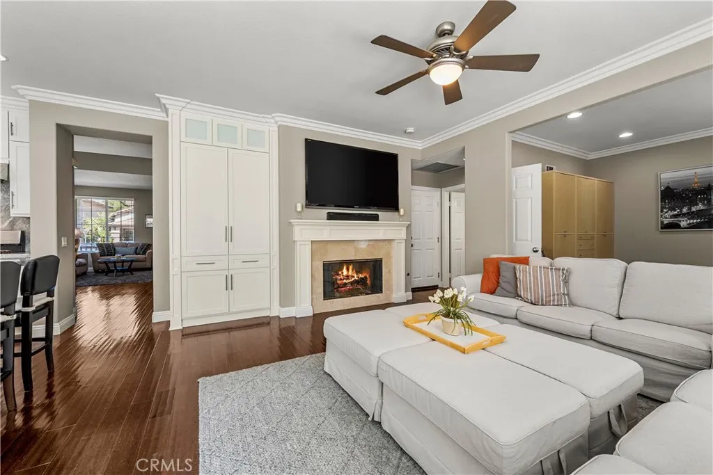 Beautifully upgraded 5 bedroom, 3 bath home offering approximately 2,300 sq ft in a desirable Anaheim Hills neighborhood. Rich hardwood flooring runs throughout the home, including the staircase, creating a warm and elegant first impression. The formal living and dining rooms are light and bright with abundant windows. The remodeled kitchen features granite countertops with full backsplash, white cabinetry with soft-close doors and drawers, a large center island with pendant lighting, recessed lighting, and stainless steel appliances including an LG counter-depth refrigerator, LG dual oven gas range, Fisher & Paykel dual drawer dishwasher, and Sharp built-in microwave drawer. Custom features include pull-out spice racks, Lazy Susan cabinetry, pantry drawers, and a pull-out trash system. The adjacent breakfast nook has French doors leading to the backyard patio. The kitchen opens to the inviting family room with fireplace, crown molding, ceiling fan, and custom floor-to-ceiling built-in cabinetry. A main-floor office that can serve as a fourth bedroom sits adjacent to a remodeled bathroom featuring a glass-enclosed marble walk-in shower. Upstairs, double doors lead to the spacious primary suite with vaulted ceilings, ceiling fan, and two walk-in closets. The remodeled primary bath offers dual sinks, updated cabinetry, marble countertops, soaking tub, and a separate glass-enclosed marble shower. Two additional bedrooms feature recessed lighting and mirrored wardrobe doors. The loft provides flexible space for a fifth bedroom, bonus room, or office. The hall bath has been remo