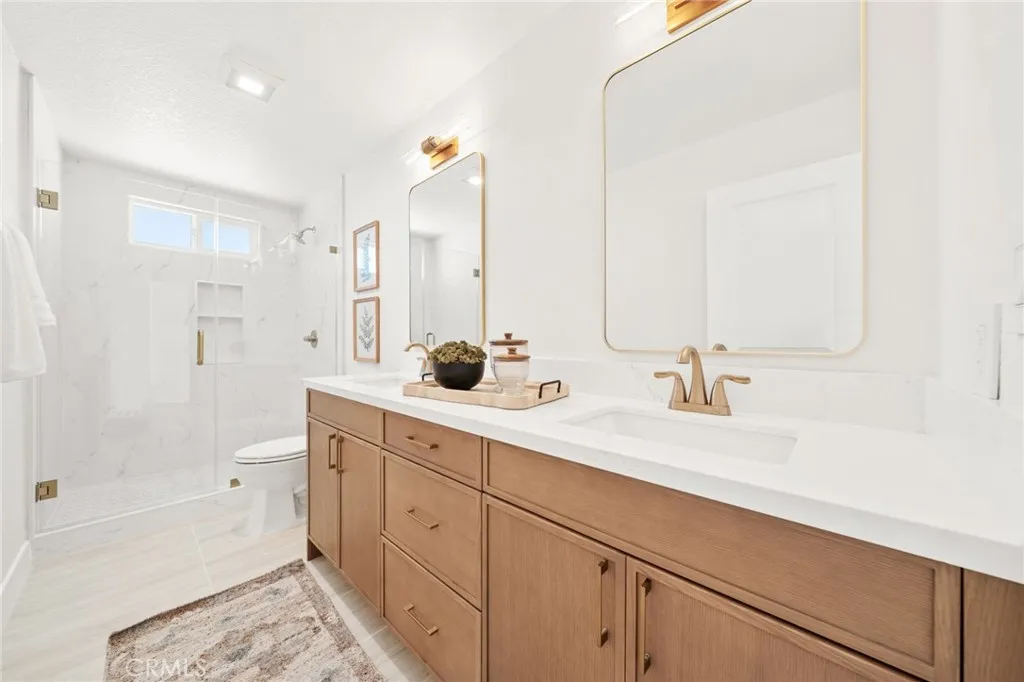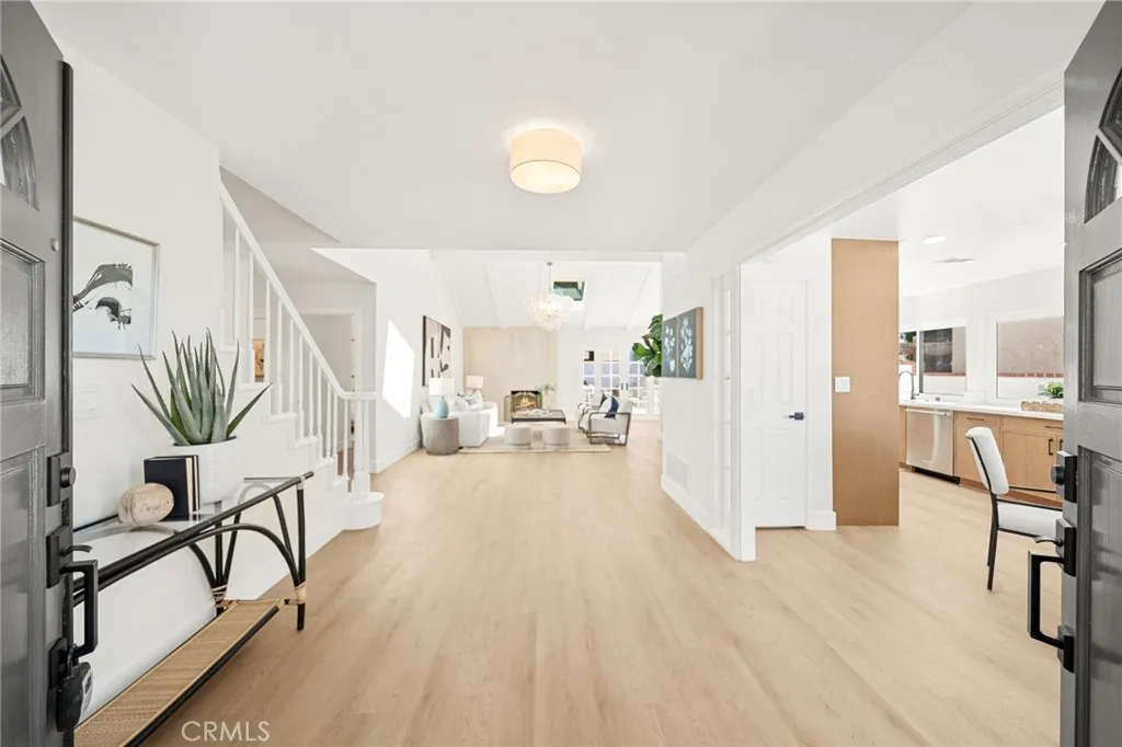 Located in the highly desirable Racquet Club community of Northwood, one of the very few neighborhoods in Irvine with no HOA dues and a low property tax rate, this beautifully remodeled home offers the perfect combination of comfort, style, and convenience. The home is assigned to award-winning Irvine Unified schools, including Brywood Elementary, Sierra Vista Middle School, and Northwood High School. Thoughtfully renovated throughout, the home features fresh exterior paint, an epoxy-coated garage floor, and a beautifully designed interior filled with natural light. The inviting front patio provides a peaceful space for relaxing or reading. Offering 5 bedrooms and 4 bathrooms, the home is highlighted by dual primary suites, providing flexibility for multi-generational living or guest accommodations. The open floor plan features soaring ceilings, skylight windows, and abundant natural light throughout. Wood-textured luxury plank vinyl flooring runs seamlessly across the home, while luxury chandeliers and pendant lighting create a refined, RH-inspired ambiance. The family room is a striking centerpiece with vaulted ceilings, skylights, and exposed wooden ceiling beams, creating an airy and welcoming space for everyday living. The formal dining room opens to the backyard, ideal for indoor-outdoor entertaining. The newly redesigned kitchen showcases solid wood cabinetry, white quartz countertops with full-height backsplash, brand-new stainless steel appliances, LED recessed lighting, and a charming breakfast nook with bay windows. The main level includes a primary suite and an