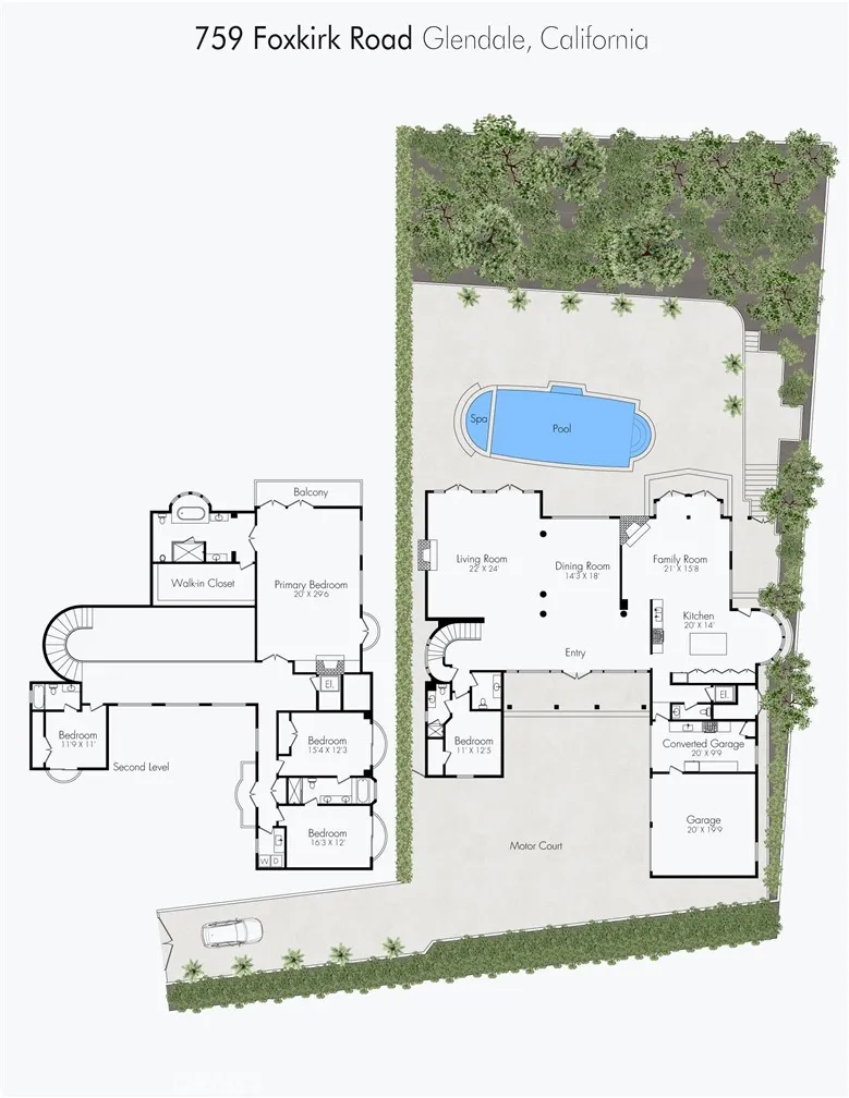Discover timeless elegance at 759 Foxkirk Road, nestled on a quiet cul-de-sac in the hills of Glendale. This exquisite residence spans an impressive 5,115 square feet of refined living space, exuding a sophisticated vintage luxury aesthetic that seamlessly blends classic grandeur with contemporary comfort. Set upon a sprawling, nearly 19,000 square foot lot, the property offers rare privacy and serenity while commanding breathtaking panoramic views of the iconic Downtown Los Angeles skylinetransforming every moment into a cinematic experience, especially as the city lights sparkle at dusk. A gated and private driveway gracefully ascends to a stately motor-court, creating a grand sense of arrival. The three-car garage provides ample space for your collection. Inside, the home features five generously appointed bedrooms and six bathrooms along with an elevator. Highlights include soaring ceilings, expansive living areas that frame the dramatic vistas, and a resort-style backyard oasis complete with a sparkling pool and spaperfect for elegant entertaining or tranquil evenings under the stars. Whether hosting distinguished guests or enjoying intimate family moments, this exceptional estate embodies the pinnacle of sophisticated California living: private, prestigious, and profoundly inspiring. A rare opportunity to own a true legacy property in one of Glendales most sought-after enclaves. Welcome home to refined luxury.